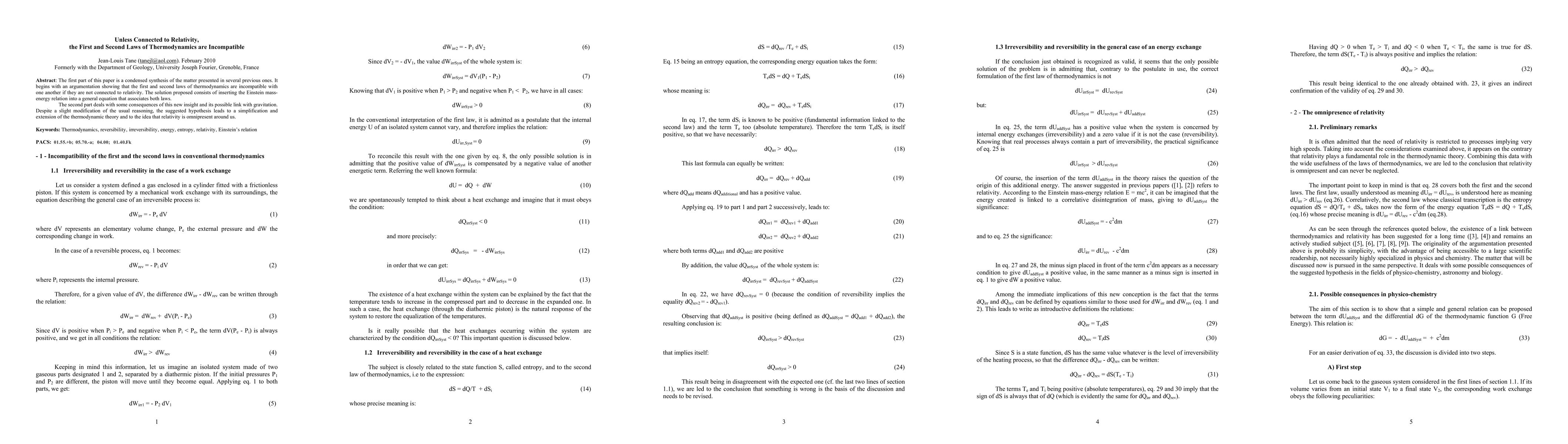 The first part of this paper is a condensed synthesis of the matter presented in several previous ones. It begins with an argumentation showing that the first and second laws of thermodynamics are incompatible with one another if they are not connected to relativity. The solution proposed consists of inserting the Einstein mass-energy relation into a general equation that associates both laws. The second part deals with some consequences of this new insight and its possible link with gravitation. Despite a slight modification of the usual reasoning, the suggested hypothesis leads to a simplification and extension of the thermodynamic theory and to the idea that relativity is omnipresent around us.