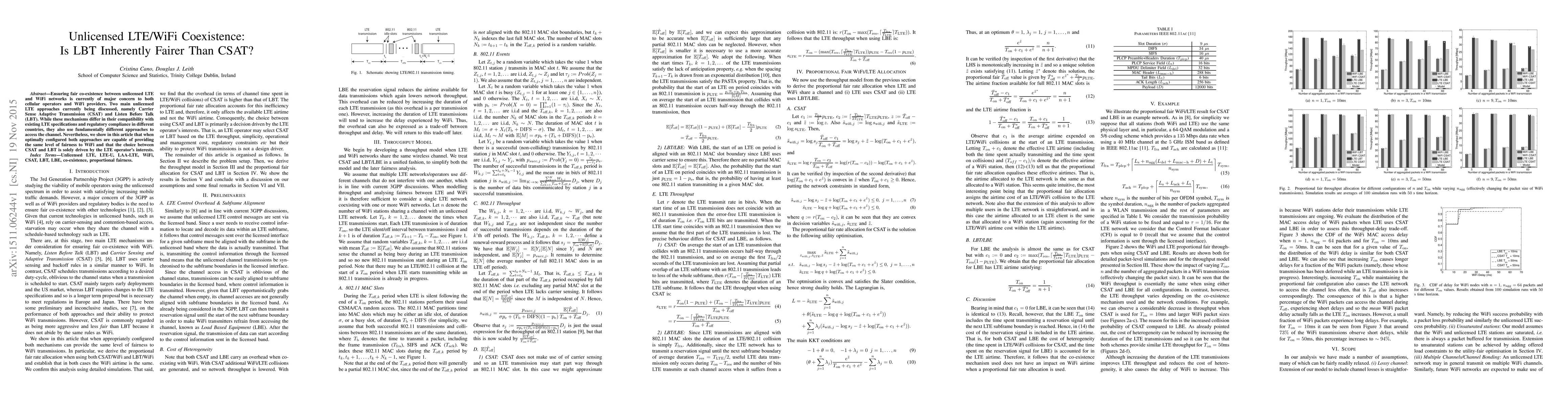 The paper develops a throughput model for LTE and WiFi coexistence, analyzing Carrier Sense Adaptive Transmission (CSAT) and Listen Before Talk (LBT) mechanisms. It uses a unified approach to simplify the model and later fairness analysis, assuming multiple LTE networks use non-interfering channels.