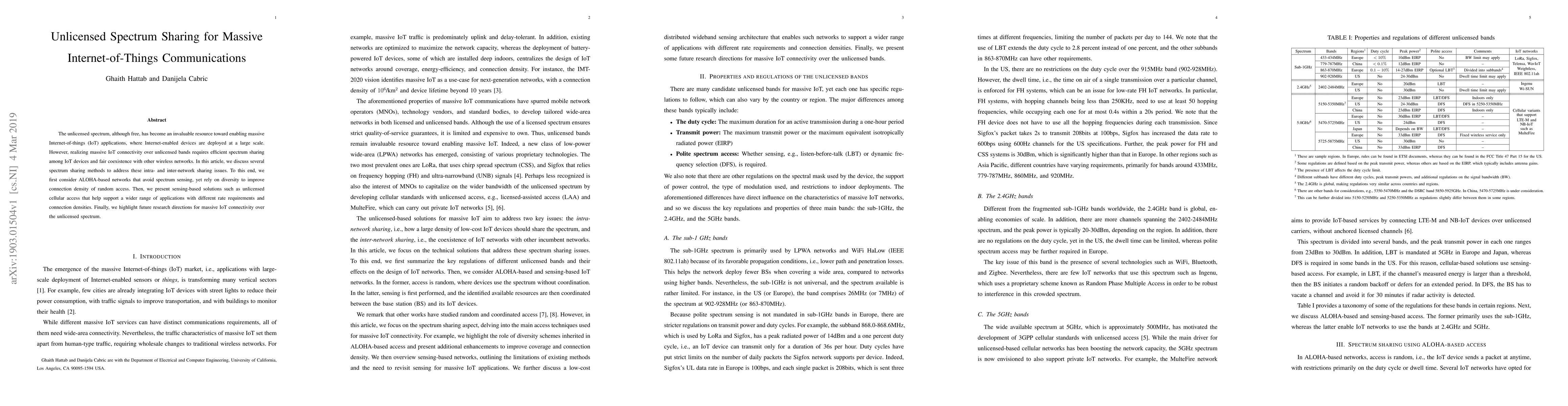 This paper explores efficient spectrum sharing methods for massive IoT devices operating on unlicensed spectrum, focusing on ALOHA-based networks and sensing-based solutions like unlicensed cellular access to ensure fair coexistence and support diverse application needs. The paper also outlines future research directions for enhancing IoT connectivity.