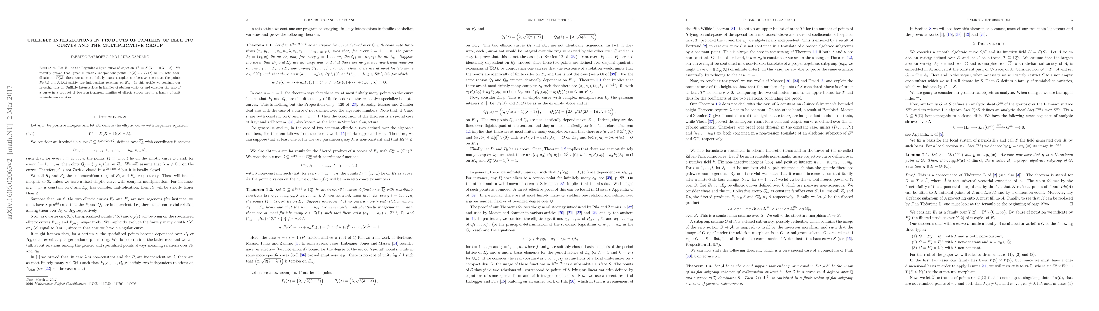 This paper investigates unlikely intersections in the context of families of elliptic curves and the multiplicative group, proving that for a given family of elliptic curves, there are only finitely many values where specific points on these curves satisfy additional independent relations. The study extends to intersections involving products of elliptic curves and split semi-abelian varieties.