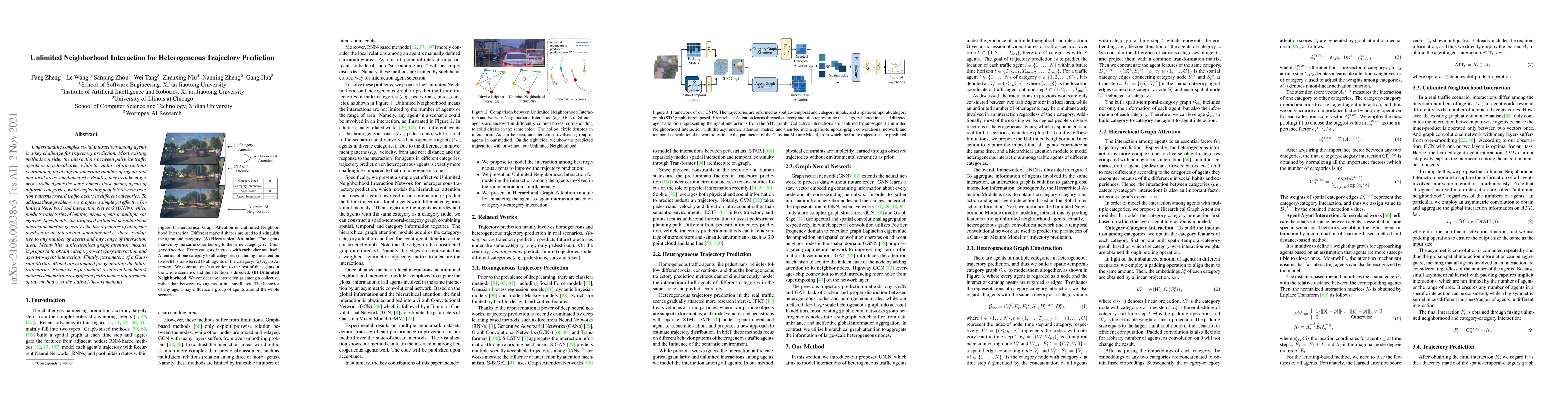 Understanding complex social interactions among agents is a key challenge for trajectory prediction. Most existing methods consider the interactions between pairwise traffic agents or in a local area, while the nature of interactions is unlimited, involving an uncertain number of agents and non-local areas simultaneously. Besides, they treat heterogeneous traffic agents the same, namely those among agents of different categories, while neglecting people's diverse reaction patterns toward traffic agents in ifferent categories. To address these problems, we propose a simple yet effective Unlimited Neighborhood Interaction Network (UNIN), which predicts trajectories of heterogeneous agents in multiple categories. Specifically, the proposed unlimited neighborhood interaction module generates the fused-features of all agents involved in an interaction simultaneously, which is adaptive to any number of agents and any range of interaction area. Meanwhile, a hierarchical graph attention module is proposed to obtain category-to-category interaction and agent-to-agent interaction. Finally, parameters of a Gaussian Mixture Model are estimated for generating the future trajectories. Extensive experimental results on benchmark datasets demonstrate a significant performance improvement of our method over the state-of-the-art methods.