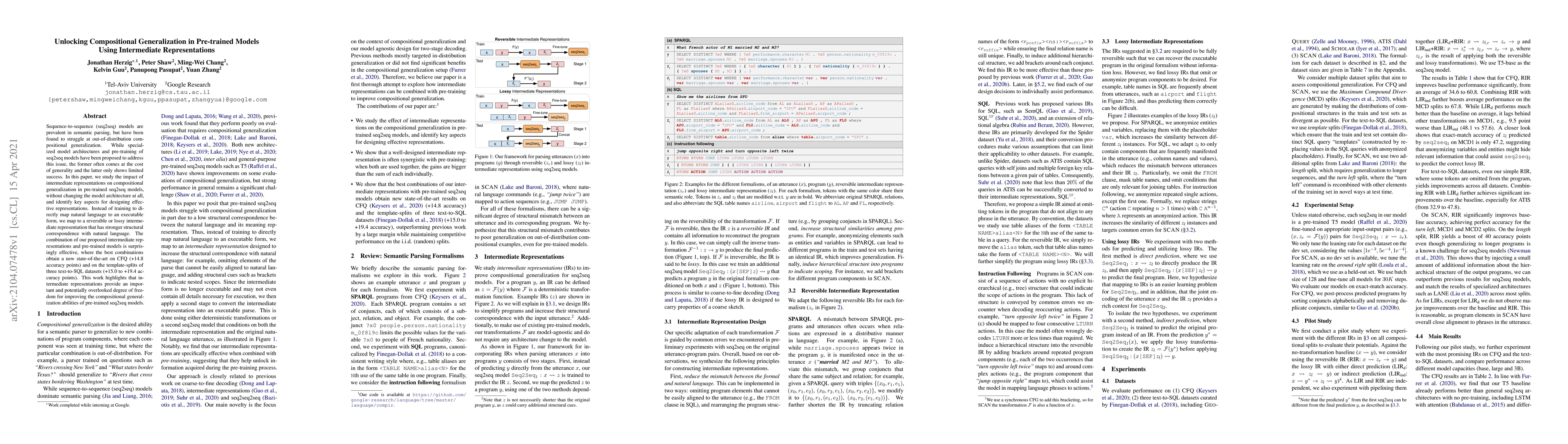 This paper investigates how intermediate representations can enhance compositional generalization in pre-trained sequence-to-sequence models without altering their architecture. The study finds that mapping to a reversible or lossy intermediate representation improves performance significantly, achieving new state-of-the-art results on CFQ and text-to-SQL datasets.