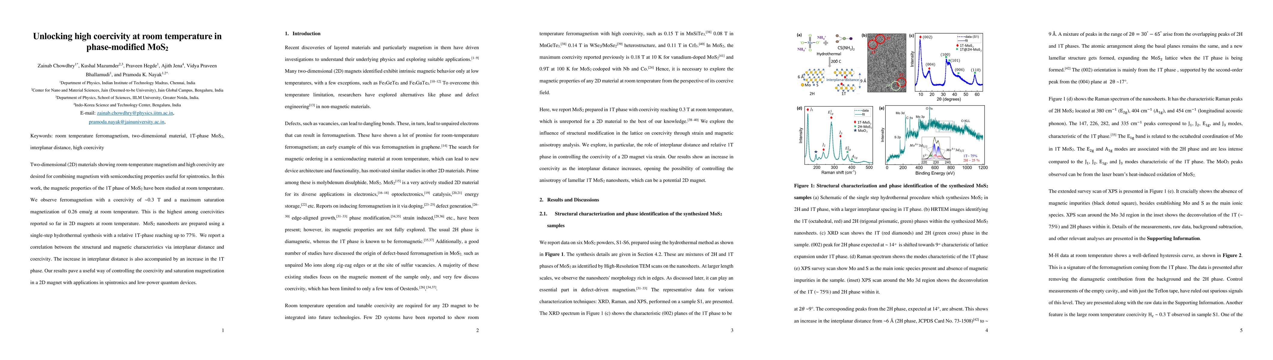 Two-dimensional (2D) materials showing room-temperature magnetism and high coercivity are desired for combining magnetism with semiconducting properties useful for spintronics. In this work, the magnetic properties of the 1T phase of MoS$_2$ have been studied at room temperature. We observe ferromagnetism with a coercivity of ~0.3 T and a maximum saturation magnetization of 0.26 emu/g at room temperature. This is the highest among coercivities reported so far in 2D magnets at room temperature. MoS$_2$ nanosheets are prepared using a single-step hydrothermal synthesis with a relative 1T-phase reaching up to 77%. We report a correlation between the structural and magnetic characteristics via interplanar distance and coercivity. The increase in interplanar distance is also accompanied by an increase in the 1T phase. Our results pave a useful way of controlling the coercivity and saturation magnetization in a 2D magnet with applications in spintronics and low-power quantum devices.