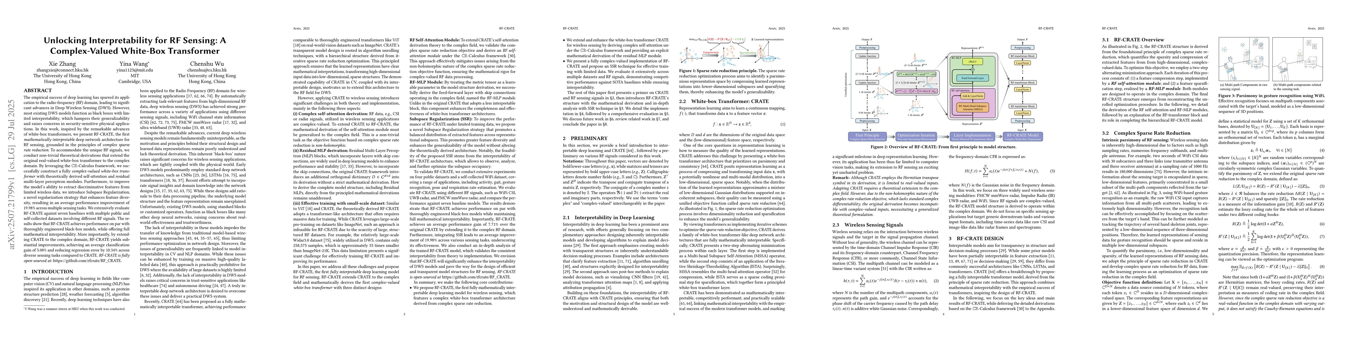 The empirical success of deep learning has spurred its application to the radio-frequency (RF) domain, leading to significant advances in Deep Wireless Sensing (DWS). However, most existing DWS models function as black boxes with limited interpretability, which hampers their generalizability and raises concerns in security-sensitive physical applications. In this work, inspired by the remarkable advances of white-box transformers, we present RF-CRATE, the first mathematically interpretable deep network architecture for RF sensing, grounded in the principles of complex sparse rate reduction. To accommodate the unique RF signals, we conduct non-trivial theoretical derivations that extend the original real-valued white-box transformer to the complex domain. By leveraging the CR-Calculus framework, we successfully construct a fully complex-valued white-box transformer with theoretically derived self-attention and residual multi-layer perceptron modules. Furthermore, to improve the model's ability to extract discriminative features from limited wireless data, we introduce Subspace Regularization, a novel regularization strategy that enhances feature diversity, resulting in an average performance improvement of 19.98% across multiple sensing tasks. We extensively evaluate RF-CRATE against seven baselines with multiple public and self-collected datasets involving different RF signals. The results show that RF-CRATE achieves performance on par with thoroughly engineered black-box models, while offering full mathematical interpretability. More importantly, by extending CRATE to the complex domain, RF-CRATE yields substantial improvements, achieving an average classification gain of 5.08% and reducing regression error by 10.34% across diverse sensing tasks compared to CRATE. RF-CRATE is fully open-sourced at: https://github.com/rfcrate/RF_CRATE.