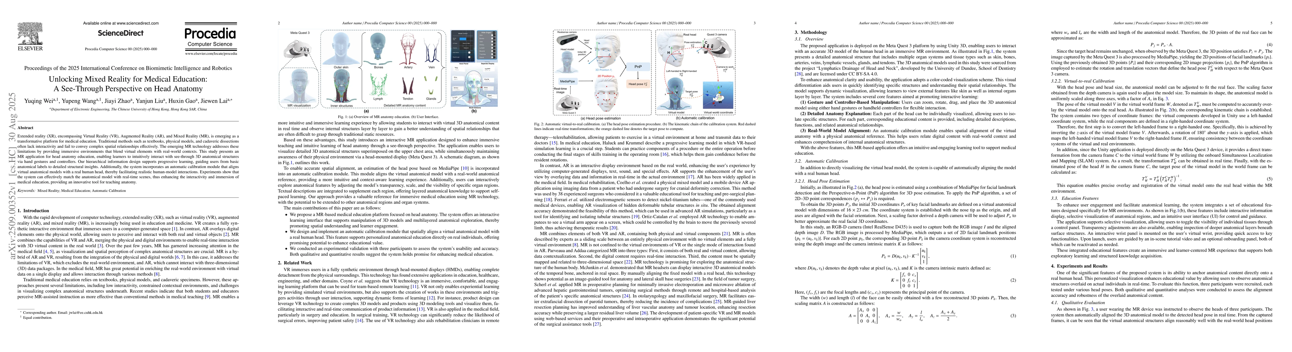 Extended reality (XR), encompassing Virtual Reality (VR), Augmented Reality (AR), and Mixed Reality (MR), is emerging as a transformative platform for medical education. Traditional methods such as textbooks, physical models, and cadaveric dissections often lack interactivity and fail to convey complex spatial relationships effectively. The emerging MR technology addresses these limitations by providing immersive environments that blend virtual elements with real-world contexts. This study presents an MR application for head anatomy education, enabling learners to intuitively interact with see-through 3D anatomical structures via hand gestures and controllers. Our hierarchical information design supports progressive learning, guiding users from basic anatomical labels to detailed structural insights. Additionally, the system incorporates an automatic calibration module that aligns virtual anatomical models with a real human head, thereby facilitating realistic human-model interactions. Experiments show that the system can effectively match the anatomical model with real-time scenes, thus enhancing the interactivity and immersion of medical education, providing an innovative tool for teaching anatomy.