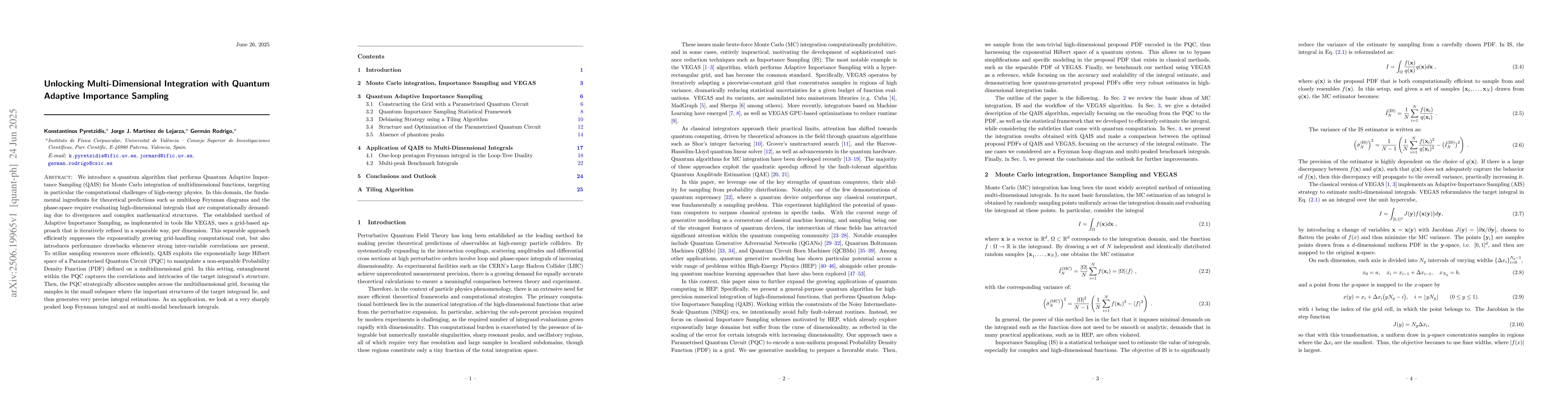 The paper presents Quantum Adaptive Importance Sampling (QAIS), a quantum algorithm designed to efficiently tackle high-dimensional integrals in computational physics, like those from multiloop Feynman diagrams. QAIS leverages a Parameterised Quantum Circuit (PQC) to manage correlations and complex structures in the integrand, offering more precise integral estimations than traditional methods.