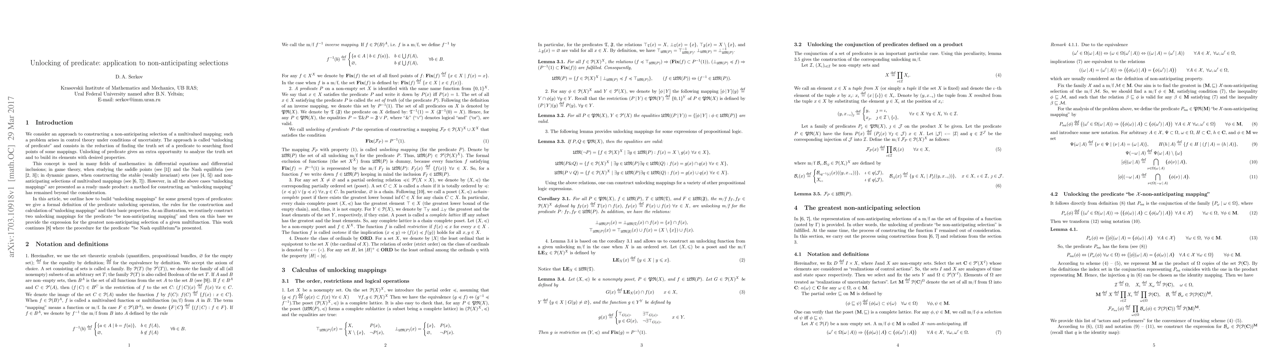 We consider an approach to constructing a non-anticipating selection of a multivalued mapping; such a problem arises in control theory under conditions of uncertainty. The approach is called "unlocking of predicate" and consists in the reduction of finding the truth set of a predicate to searching fixed points of some mappings. Unlocking of predicate gives an extra opportunity to analyze the truth set and to build its elements with desired properties. In this article, we outline how to build "unlocking mappings" for some general types of predicates: we give a formal definition of the predicate unlocking operation, the rules for the construction and calculation of "unlocking mappings" and their basic properties. As an illustration, we routinely construct two unlocking mappings for the predicate "be non-anticipating mapping" and then on this base we provide the expression for the greatest non-anticipating selection of a given multifunction.