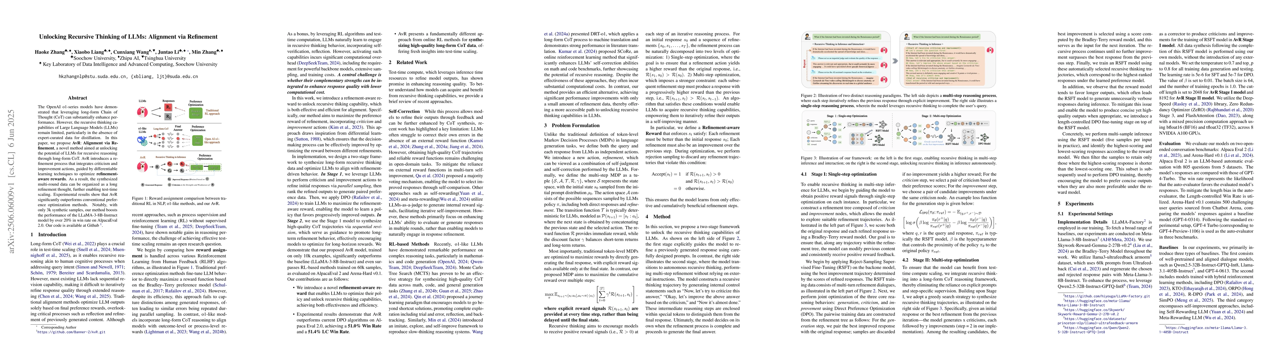 A new method called AvR (Alignment via Refinement) unlocks recursive thinking in Large Language Models by integrating criticism and improvement actions to optimize refinement-aware rewards, leading to significant performance boosts.