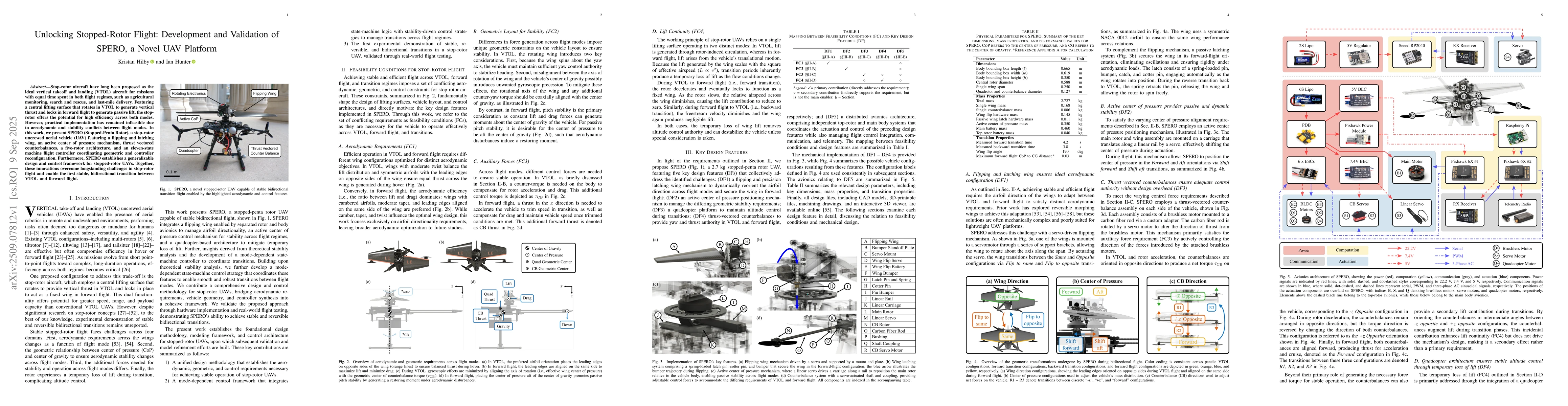 Stop-rotor aircraft have long been proposed as the ideal vertical takeoff and landing (VTOL) aircraft for missions with equal time spent in both flight regimes, such as agricultural monitoring, search and rescue, and last-mile delivery. Featuring a central lifting surface that rotates in VTOL to generate vertical thrust and locks in forward flight to generate passive lift, the stop-rotor offers the potential for high efficiency across both modes. However, practical implementation has remained infeasible due to aerodynamic and stability conflicts between flight modes. In this work, we present SPERO (Stopped-Penta Rotor), a stop-rotor uncrewed aerial vehicle (UAV) featuring a flipping and latching wing, an active center of pressure mechanism, thrust vectored counterbalances, a five-rotor architecture, and an eleven-state machine flight controller coordinating geometric and controller reconfiguration. Furthermore, SPERO establishes a generalizable design and control framework for stopped-rotor UAVs. Together, these innovations overcome longstanding challenges in stop-rotor flight and enable the first stable, bidirectional transition between VTOL and forward flight.