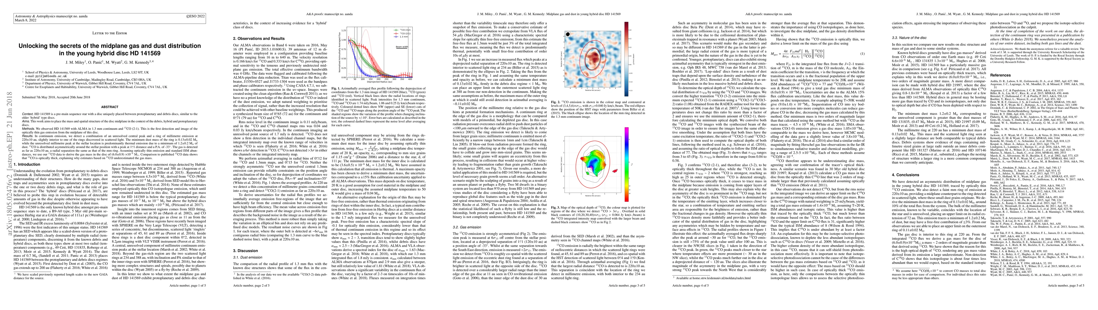 HD141569 is a pre-main sequence star with a disc uniquely placed between protoplanetary and debris discs, similar to the older `hybrid' type discs. This work aims to place the mass and spatial structure of the disc midplane in the context of the debris, hybrid and protoplanetary discs. We observed HD~141569 with ALMA in 1.3~mm continuum and $^{13}$CO (2-1). This is the first detection and image of the optically thin gas emission from the midplane of this disc. In continuum emission, we detect a combination of an unresolved central peak and a ring of millimetre emission at 220$\pm$10~au, slightly interior to one of the rings discovered in scattered light. The minimum dust mass of the ring is 0.13$\pm$0.02~M$_{\oplus}$ while the unresolved millimetre peak at the stellar location is predominantly thermal emission due to a minimum of 1.2$\pm$0.2~M$_{\oplus}$ of dust. $^{13}$CO is distributed asymmetrically around the stellar position with a peak at 1.1" distance and a P.A. of -33$^\circ$. The gas is detected as far as 220$\pm$10~au, a radial separation the same as that of the mm ring. Assuming optically thin emission and standard ISM abundances, we use our $^{13}$CO data to derive the gas mass in the disc of (6.0$\pm$0.9) $\times 10^{-4}~$M$_\odot$. Comparison to published $^{12}$CO data shows that $^{12}$CO is optically thick, explaining why estimates based on $^{12}$CO underestimated the gas mass.