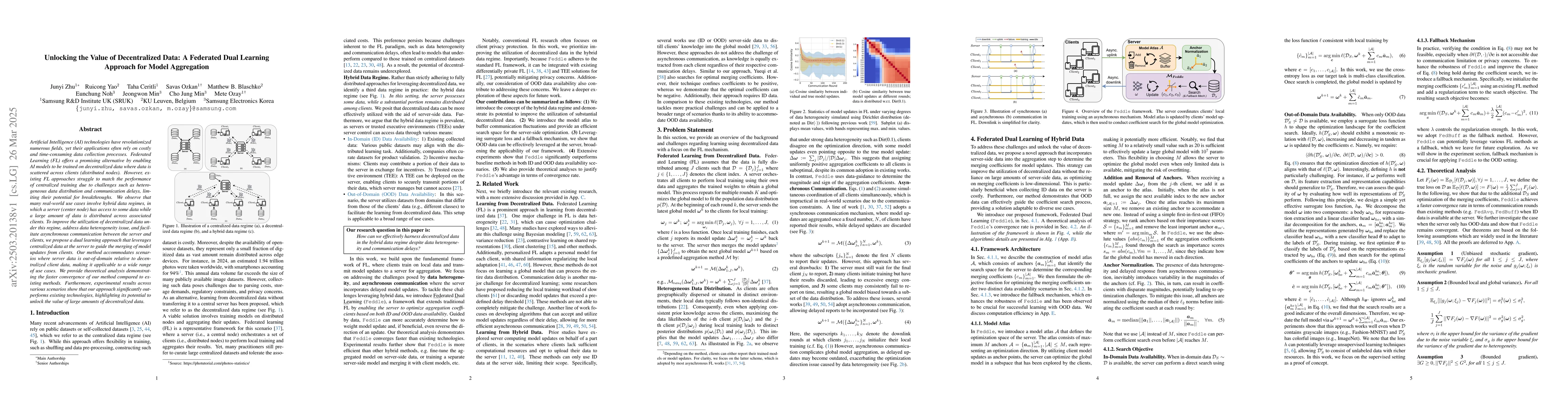 The research proposes a federated dual learning approach (Feddle) for model aggregation in a hybrid data regime, addressing challenges like data heterogeneity and communication delays in federated learning (FL). Feddle leverages centralized data at the server to guide merging of model updates from clients, accommodating out-of-domain (OOD) scenarios where server data differs significantly from client data.