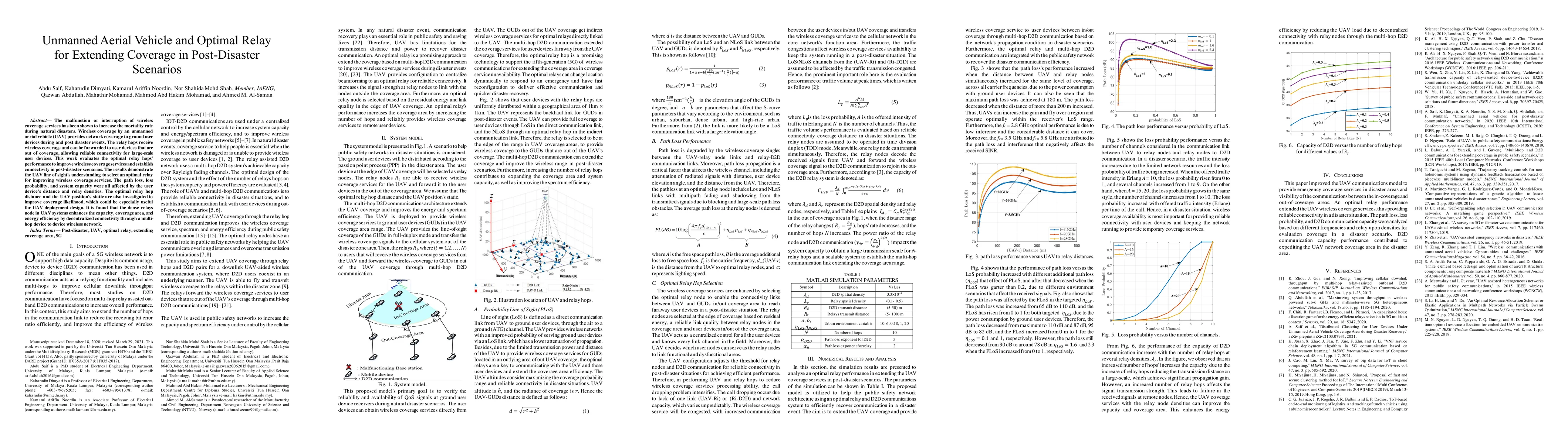 The malfunction or interruption of wireless coverage services has been shown to increase the mortality rate during natural disasters. Wireless coverage by an unmanned aerial vehicle (UAV) provides network coverage to ground user devices during and post-disaster events. The relay hops receive wireless coverage and can be forwarded to user devices that are out of coverage allowing reliable connectivity for large-scale user devices. This work evaluates the optimal relay hops performance to improve wireless coverage services and establish connectivity in post-disaster scenarios. The results demonstrate the UAV line of sights understanding to select an optimal relay for improving wireless coverage services. The path loss probability and system capacity were all affected by the user device distance and relay densities. The optimal relay hop distance and the UAV positions static are also investigated to improve coverage likelihood which could be especially useful for UAV deployment design. It is found that the dense relays node in UAV systems enhances the capacity coverage area and energy efficiency by decentralized connectivity through a multihop device to device wireless network.