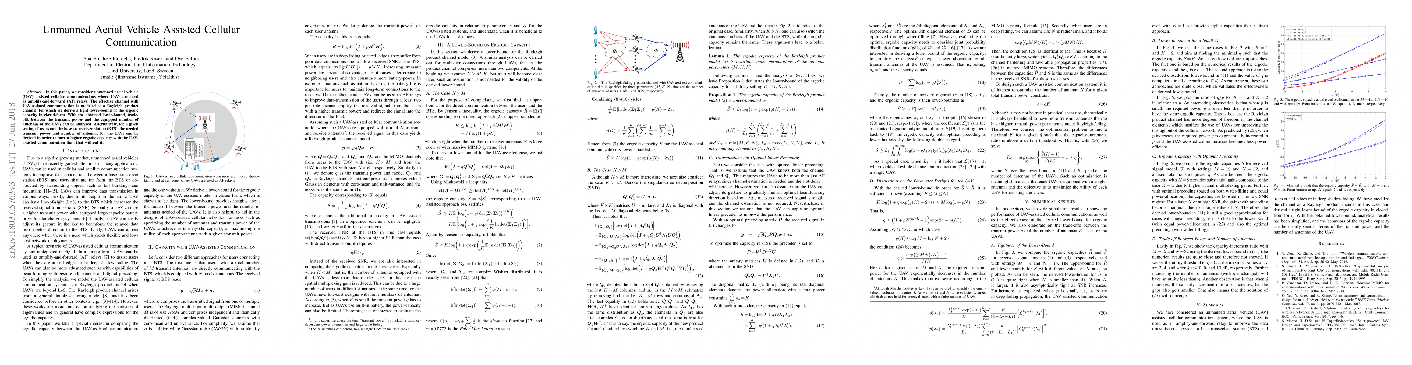 In this paper, we consider unmanned aerial vehicles (UAVs) assisted cellular communication system, where UAVs can be used as amplify-and-forward (AF) relays. The effective channel with UAV assisted communication can be modeled as a Rayleigh product-channel, and we derive a tight lower-bound of the ergodic capacity in closed-form. With the obtained lower-bound, trade-offs between the transmit power and the equipped number of antennas of the UAVs can be analyzed. Alternatively, for a giving setting of users and the base-transceiver station (BTS), the needed transmit power and number of antennas for the UAVs can be derived in order to have a higher ergodic capacity with the UAV assisted communication than that without it.