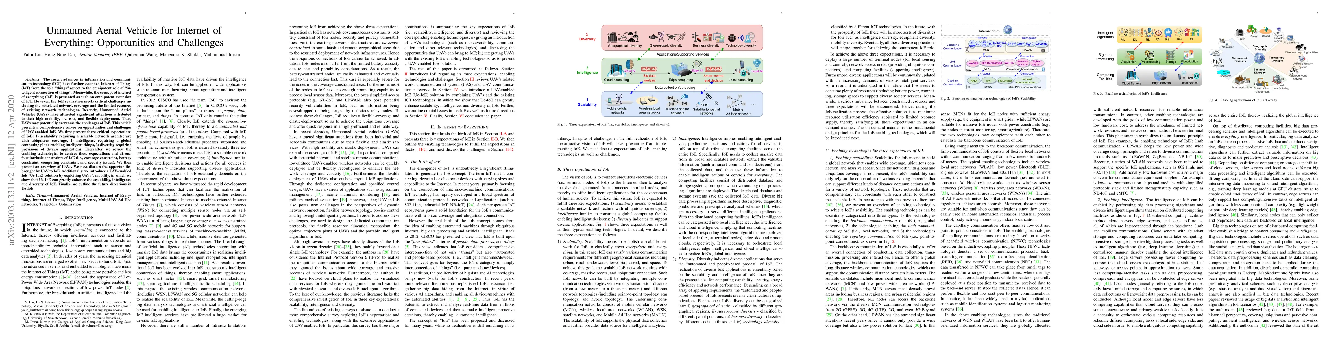 This paper surveys the opportunities and challenges of integrating Unmanned Aerial Vehicles (UAVs) into the Internet of Everything (IoE) to address its scalability, intelligence, and diversity. It highlights UAVs' potential to overcome IoE's coverage, battery, computing, and security constraints, while proposing a UAV-enabled IoE solution to enhance these aspects.