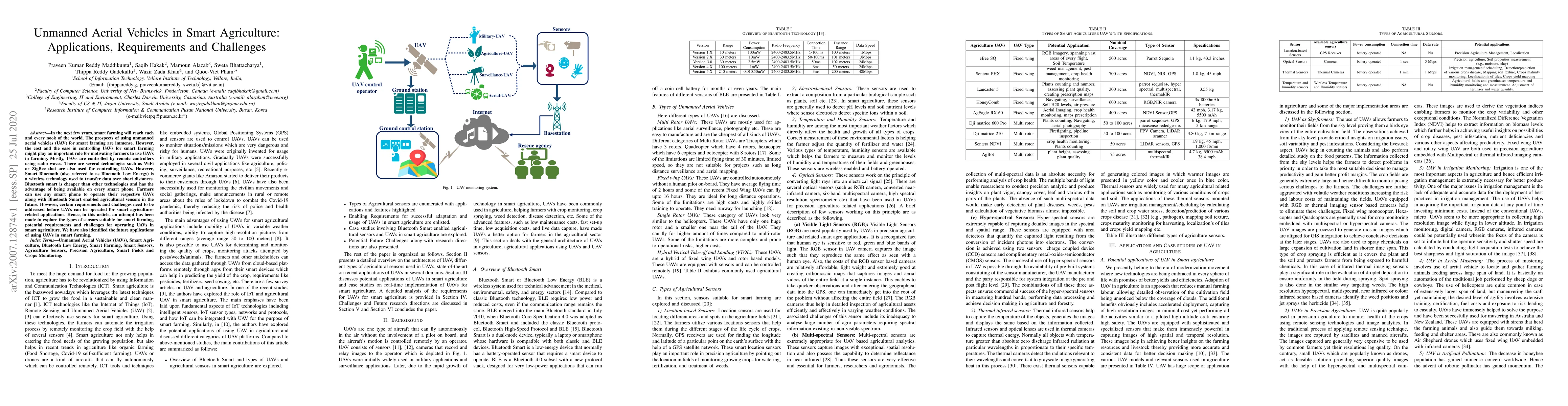 In the next few years, smart farming will reach each and every nook of the world. The prospects of using unmanned aerial vehicles (UAV) for smart farming are immense. However, the cost and the ease in controlling UAVs for smart farming might play an important role for motivating farmers to use UAVs in farming. Mostly, UAVs are controlled by remote controllers using radio waves. There are several technologies such as WiFi or ZigBee that are also used for controlling UAVs. However, Smart Bluetooth (also referred to as Bluetooth Low Energy) is a wireless technology used to transfer data over short distances. Bluetooth smart is cheaper than other technologies and has the advantage of being available on every smart phone. Farmers can use any smart phone to operate their respective UAVs along with Bluetooth Smart enabled agricultural sensors in the future. However, certain requirements and challenges need to be addressed before UAVs can be operated for smart agriculture-related applications. Hence, in this article, an attempt has been made to explore the types of sensors suitable for smart farming, potential requirements and challenges for operating UAVs in smart agriculture. We have also identified the future applications of using UAVs in smart farming.