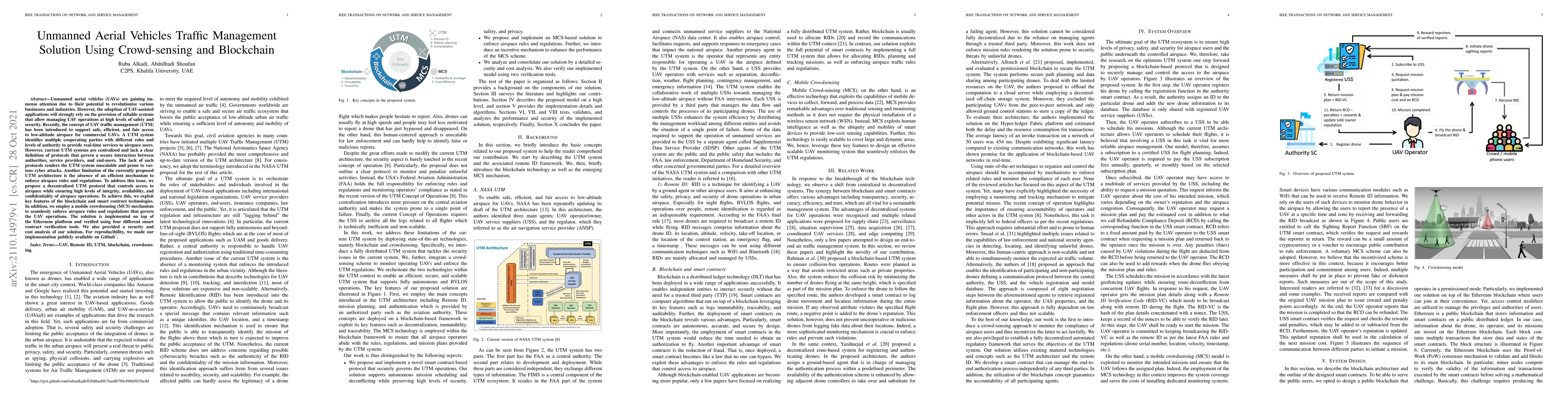 This paper proposes a decentralized Unmanned Aerial Vehicles (UAV) traffic management (UTM) solution using blockchain and mobile crowdsensing to enhance the safety, security, and scalability of UAV operations. The solution leverages smart contracts on the Ethereum platform to enforce airspace rules and regulations, ensuring integrity, availability, and confidentiality, while also making the implementation publicly available for reproducibility.
