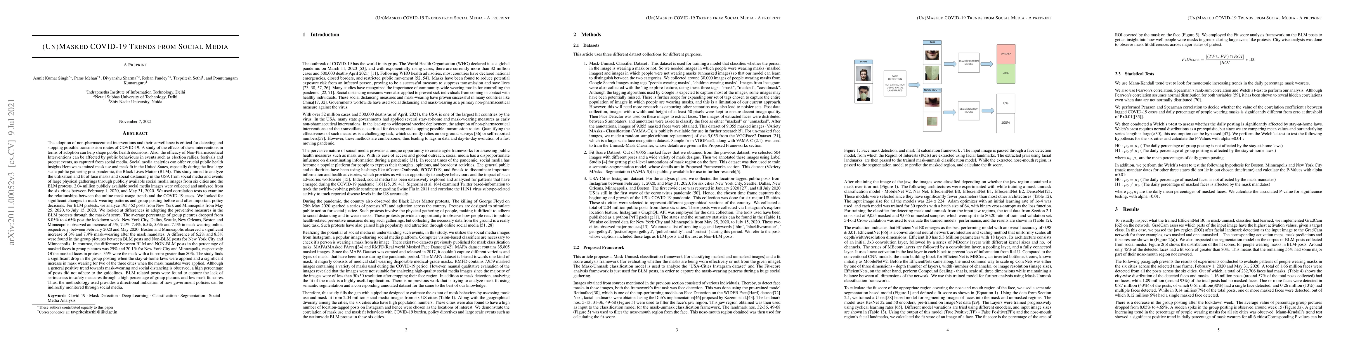Wearing masks is a useful protection method against COVID-19, which has caused widespread economic and social impact worldwide. Across the globe, governments have put mandates for the use of face masks, which have received both positive and negative reaction. Online social media provides an exciting platform to study the use of masks and analyze underlying mask-wearing patterns. In this article, we analyze 2.04 million social media images for six US cities. An increase in masks worn in images is seen as the COVID-19 cases rose, particularly when their respective states imposed strict regulations. We also found a decrease in the posting of group pictures as stay-at-home laws were put into place. Furthermore, mask compliance in the Black Lives Matter protest was analyzed, eliciting that 40% of the people in group photos wore masks, and 45% of them wore the masks with a fit score of greater than 80%. We introduce two new datasets, VAriety MAsks - Classification (VAMA-C) and VAriety MAsks - Segmentation (VAMA-S), for mask detection and mask fit analysis tasks, respectively. For the analysis, we create two frameworks, face mask detector (for classifying masked and unmasked faces) and mask fit analyzer (a semantic segmentation based model to calculate a mask-fit score). The face mask detector achieved a classification accuracy of 98%, and the semantic segmentation model for the mask fit analyzer achieved an Intersection Over Union (IOU) score of 98%. We conclude that such a framework can be used to evaluate the effectiveness of such public health strategies using social media platforms in times of pandemic.