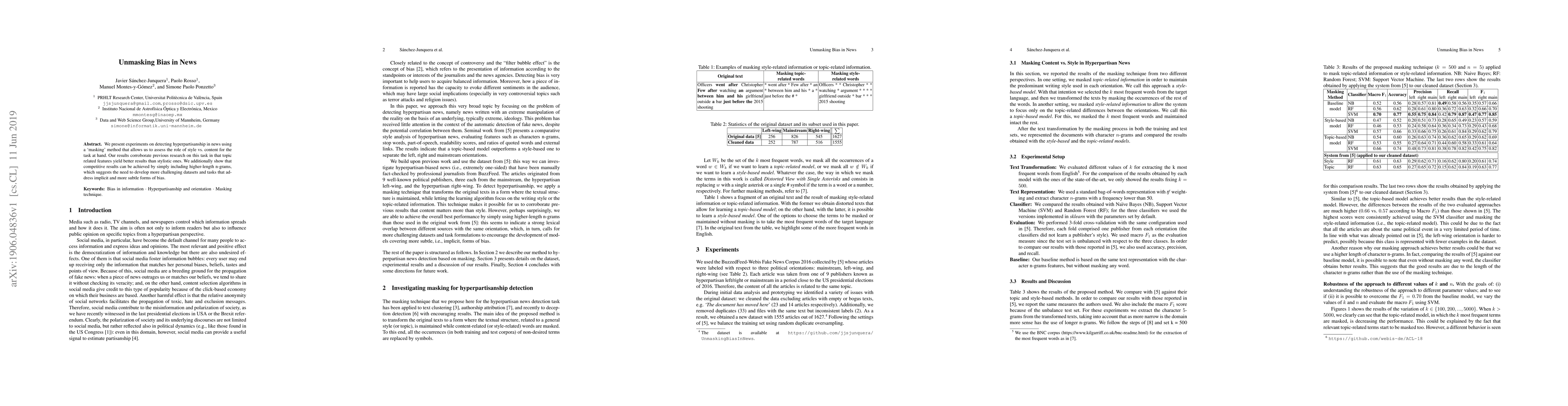 We present experiments on detecting hyperpartisanship in news using a 'masking' method that allows us to assess the role of style vs. content for the task at hand. Our results corroborate previous research on this task in that topic related features yield better results than stylistic ones. We additionally show that competitive results can be achieved by simply including higher-length n-grams, which suggests the need to develop more challenging datasets and tasks that address implicit and more subtle forms of bias.