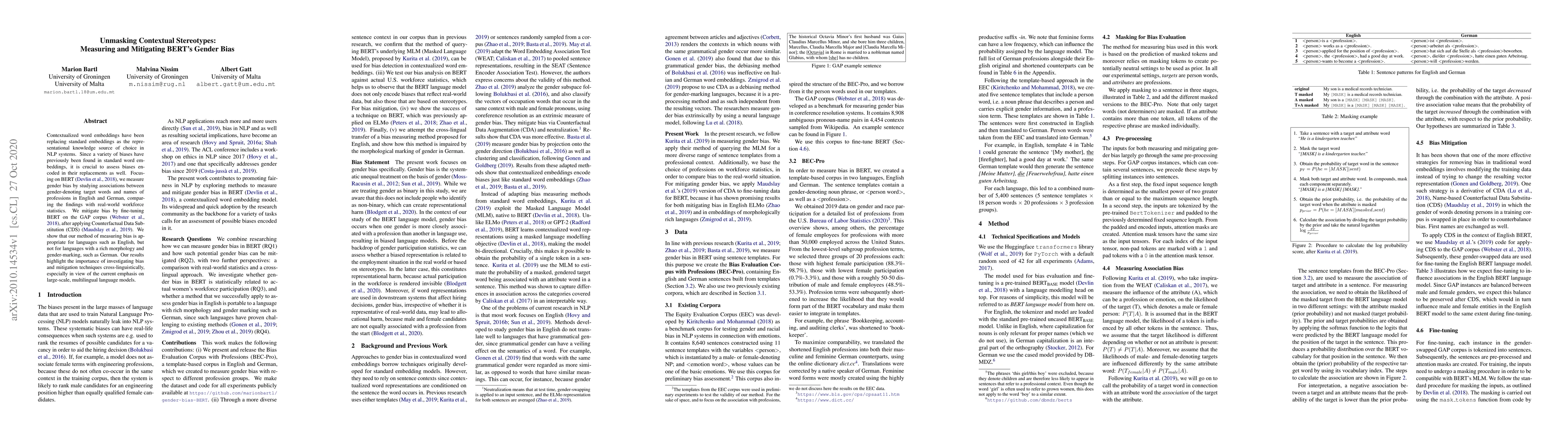 This paper measures gender bias in BERT's contextual word embeddings by analyzing associations between gender-denoting words and professions, comparing these with real-world data, and finds that fine-tuning BERT on the GAP corpus using Counterfactual Data Substitution mitigates bias effectively. However, the method is more suitable for English than for morphologically rich languages like German.