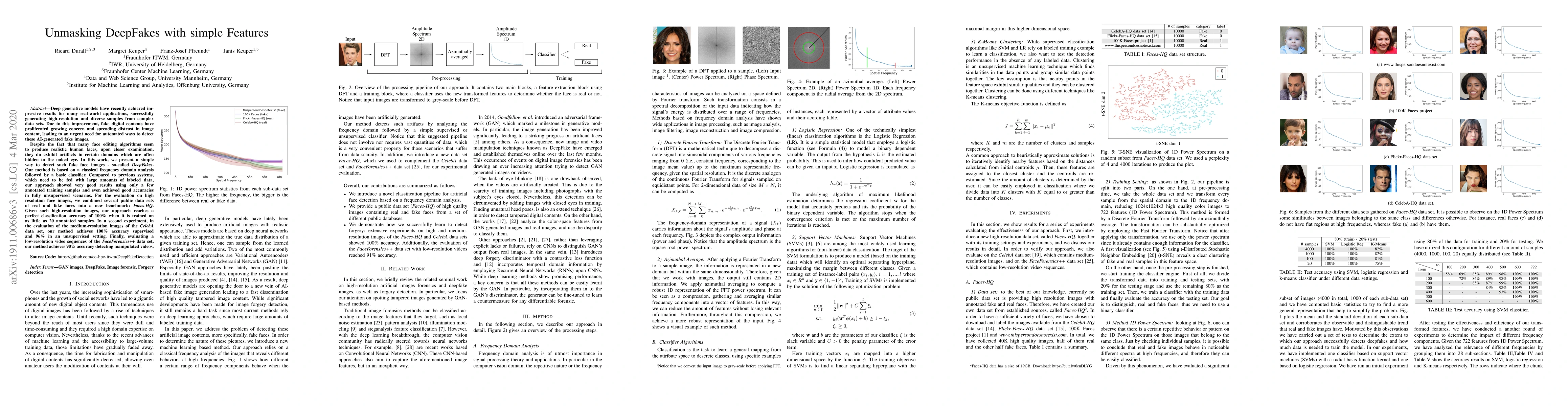 Deep generative models have recently achieved impressive results for many real-world applications, successfully generating high-resolution and diverse samples from complex datasets. Due to this improvement, fake digital contents have proliferated growing concern and spreading distrust in image content, leading to an urgent need for automated ways to detect these AI-generated fake images. Despite the fact that many face editing algorithms seem to produce realistic human faces, upon closer examination, they do exhibit artifacts in certain domains which are often hidden to the naked eye. In this work, we present a simple way to detect such fake face images - so-called DeepFakes. Our method is based on a classical frequency domain analysis followed by basic classifier. Compared to previous systems, which need to be fed with large amounts of labeled data, our approach showed very good results using only a few annotated training samples and even achieved good accuracies in fully unsupervised scenarios. For the evaluation on high resolution face images, we combined several public datasets of real and fake faces into a new benchmark: Faces-HQ. Given such high-resolution images, our approach reaches a perfect classification accuracy of 100% when it is trained on as little as 20 annotated samples. In a second experiment, in the evaluation of the medium-resolution images of the CelebA dataset, our method achieves 100% accuracy supervised and 96% in an unsupervised setting. Finally, evaluating a low-resolution video sequences of the FaceForensics++ dataset, our method achieves 91% accuracy detecting manipulated videos. Source Code: https://github.com/cc-hpc-itwm/DeepFakeDetection