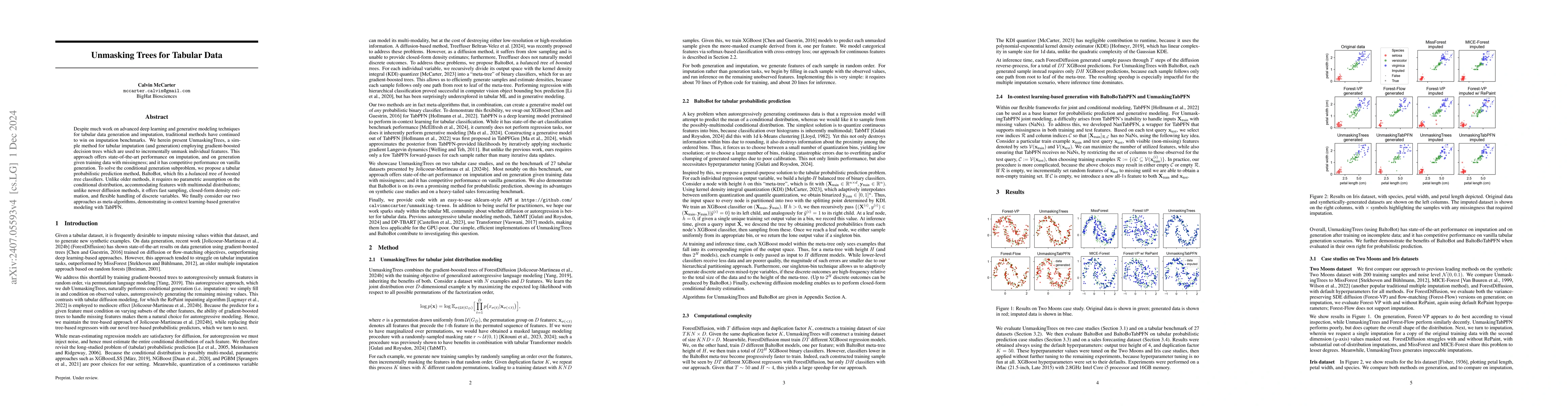 Summary: UnmaskingTrees is a method and open-source software for generating and imputing tabular data, demonstrating that gradient-boosted trees incrementally unmasking features provide a robust baseline for imputation tasks.