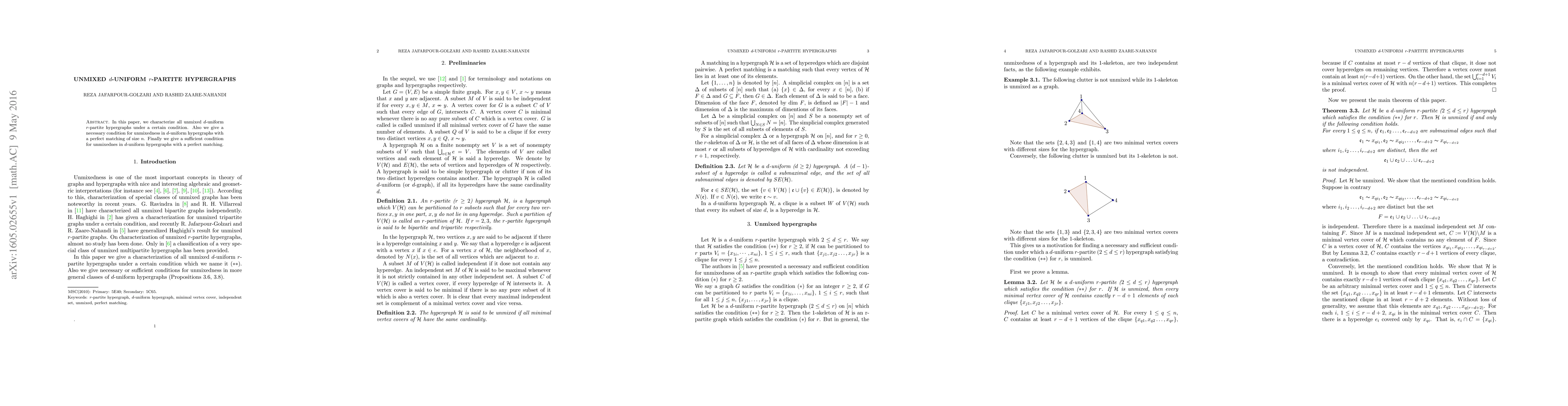 This paper characterizes unmixed d-uniform r-partite hypergraphs under specific conditions and provides necessary and sufficient conditions for unmixedness in d-uniform hypergraphs featuring perfect matchings of size n.
