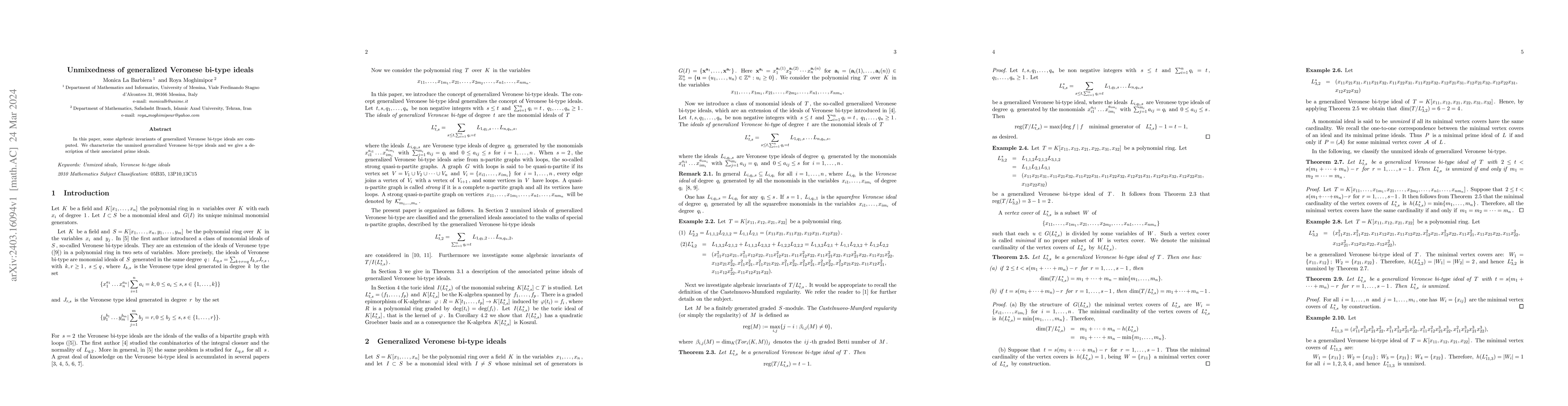 This paper computes algebraic invariants for generalized Veronese bi-type ideals and characterizes unmixed ideals among them, providing a detailed description of their associated prime ideals.