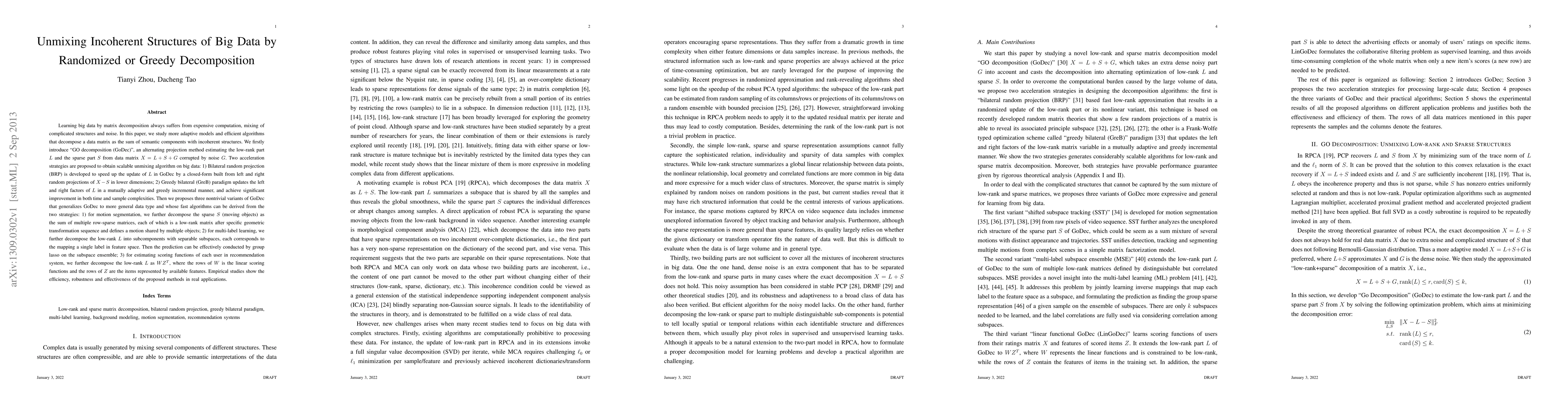 Learning big data by matrix decomposition always suffers from expensive computation, mixing of complicated structures and noise. In this paper, we study more adaptive models and efficient algorithms that decompose a data matrix as the sum of semantic components with incoherent structures. We firstly introduce "GO decomposition (GoDec)", an alternating projection method estimating the low-rank part $L$ and the sparse part $S$ from data matrix $X=L+S+G$ corrupted by noise $G$. Two acceleration strategies are proposed to obtain scalable unmixing algorithm on big data: 1) Bilateral random projection (BRP) is developed to speed up the update of $L$ in GoDec by a closed-form built from left and right random projections of $X-S$ in lower dimensions; 2) Greedy bilateral (GreB) paradigm updates the left and right factors of $L$ in a mutually adaptive and greedy incremental manner, and achieve significant improvement in both time and sample complexities. Then we proposes three nontrivial variants of GoDec that generalizes GoDec to more general data type and whose fast algorithms can be derived from the two strategies......