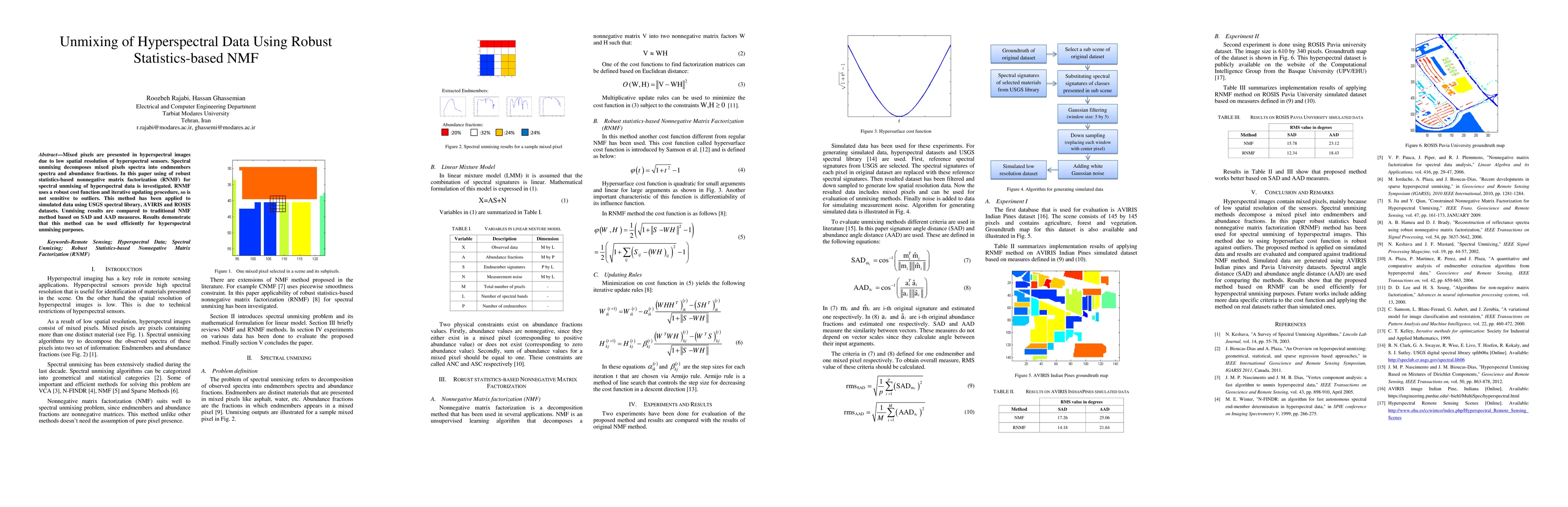 This paper explores the use of robust statistics-based nonnegative matrix factorization (RNMF) for spectral unmixing in hyperspectral data, showing improved performance over traditional NMF by using a robust cost function. Results from simulated and real datasets demonstrate the efficiency of RNMF in decomposing mixed pixels.