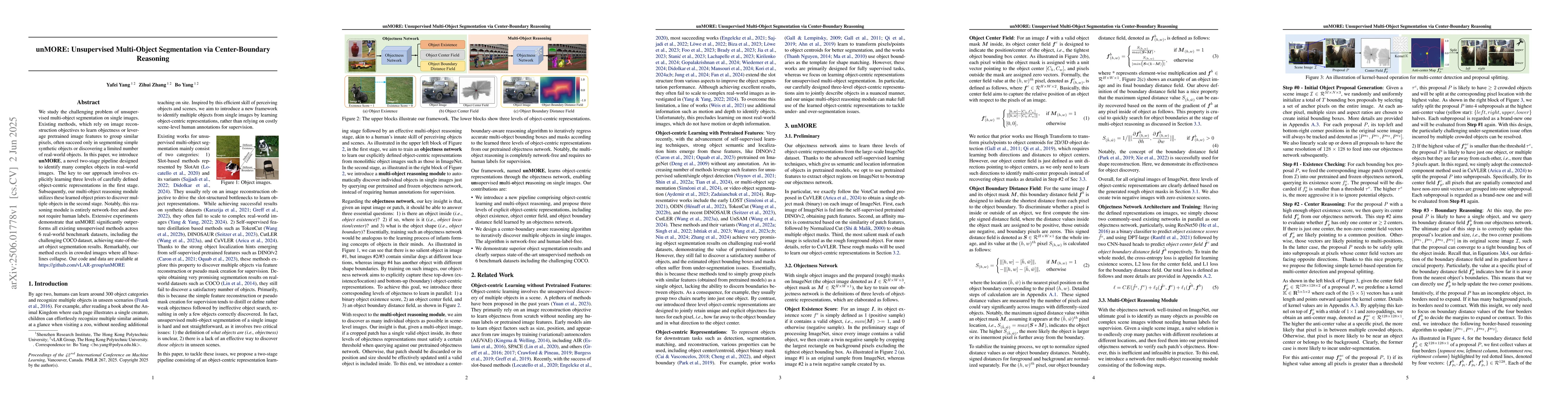 We study the challenging problem of unsupervised multi-object segmentation on single images. Existing methods, which rely on image reconstruction objectives to learn objectness or leverage pretrained image features to group similar pixels, often succeed only in segmenting simple synthetic objects or discovering a limited number of real-world objects. In this paper, we introduce unMORE, a novel two-stage pipeline designed to identify many complex objects in real-world images. The key to our approach involves explicitly learning three levels of carefully defined object-centric representations in the first stage. Subsequently, our multi-object reasoning module utilizes these learned object priors to discover multiple objects in the second stage. Notably, this reasoning module is entirely network-free and does not require human labels. Extensive experiments demonstrate that unMORE significantly outperforms all existing unsupervised methods across 6 real-world benchmark datasets, including the challenging COCO dataset, achieving state-of-the-art object segmentation results. Remarkably, our method excels in crowded images where all baselines collapse.
