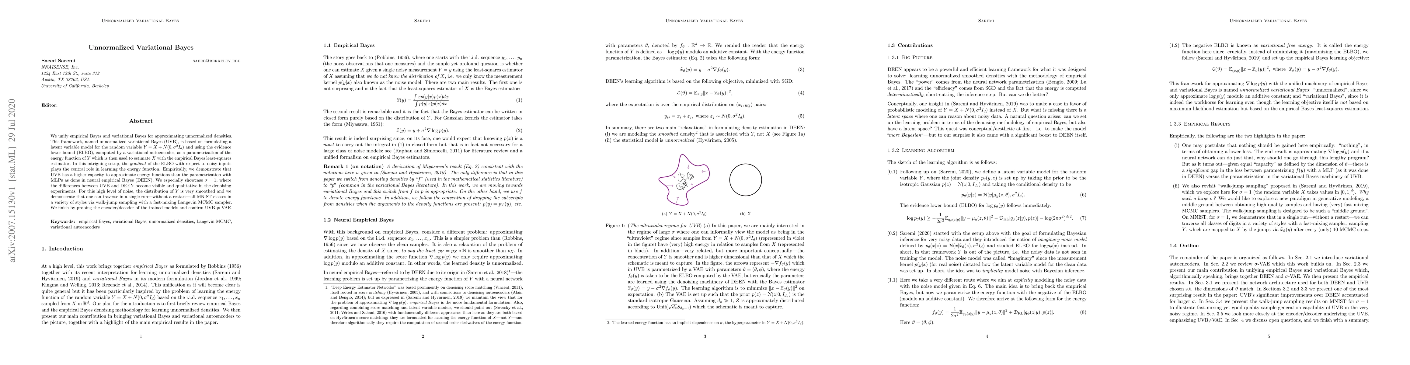 Unnormalized Variational Bayes (UVB) unifies empirical Bayes and variational Bayes to approximate unnormalized densities using a latent variable model and an ELBO computed by a variational autoencoder. Empirical results show UVB's superior ability to approximate energy functions compared to MLPs, especially under high noise levels, demonstrating smooth distribution traversal and fast-mixing Langevin MCMC sampling.