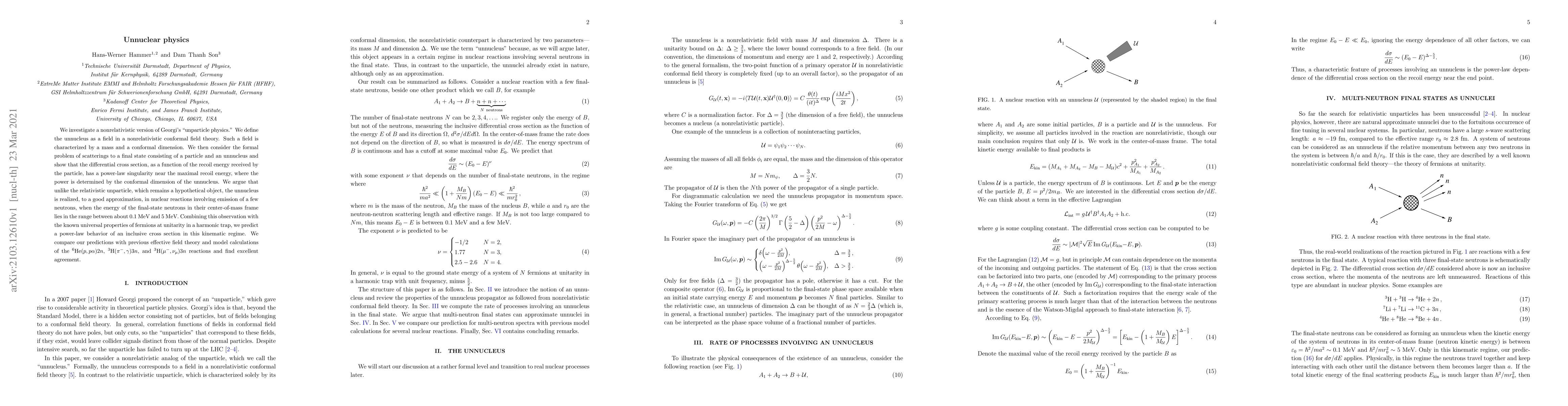 We investigate a nonrelativistic version of Georgi's "unparticle physics." We define the unnucleus as a field in a nonrelativistic conformal field theory. Such a field is characterized by a mass and a conformal dimension. We then consider the formal problem of scatterings to a final state consisting of a particle and an unnucleus and show that the differential cross section, as a function of the recoil energy received by the particle, has a power-law singularity near the maximal recoil energy, where the power is determined by the conformal dimension of the unnucleus. We argue that unlike the relativistic unparticle, which remains a hypothetical object, the unnucleus is realized, to a good approximation, in nuclear reactions involving emission of a few neutrons, when the energy of the final-state neutrons in their center-of-mass frame lies in the range between about 0.1 MeV and 5 MeV. Combining this observation with the known universal properties of fermions at unitarity in a harmonic trap, we predict a power-law behavior of an inclusive cross section in this kinematic regime. We compare our predictions with previous effective field theory and model calculations of the $^6$He$(p,p\alpha)2n$, $^3$H$(\pi^-,\gamma)3n$, and $^3$H$(\mu^-,\nu_\mu)3n$ reactions and find excellent agreement.