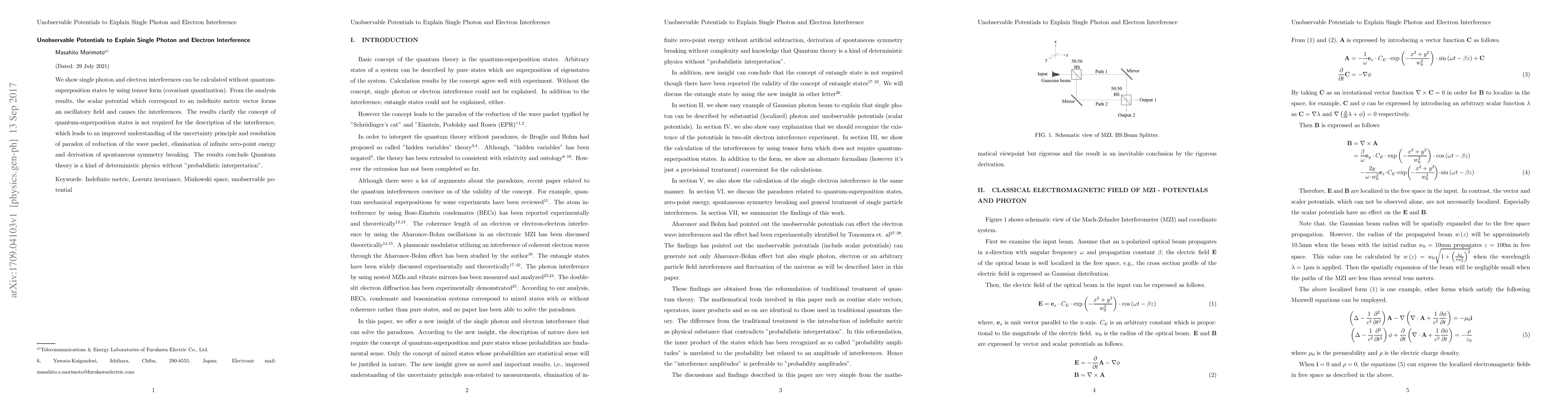 We show single photon and electron interferences can be calculated without quantum-superposition states by using tensor form (covariant quantization). From the analysis results, the scalar potential which correspond to an indefinite metric vector forms an oscillatory field and causes the interferences. The results clarify the concept of quantum-superposition states is not required for the description of the interference, which leads to an improved understanding of the uncertainty principle and resolution of paradox of reduction of the wave packet, elimination of infinite zero-point energy and derivation of spontaneous symmetry breaking. The results conclude Quantum theory is a kind of deterministic physics without "probabilistic interpretation".