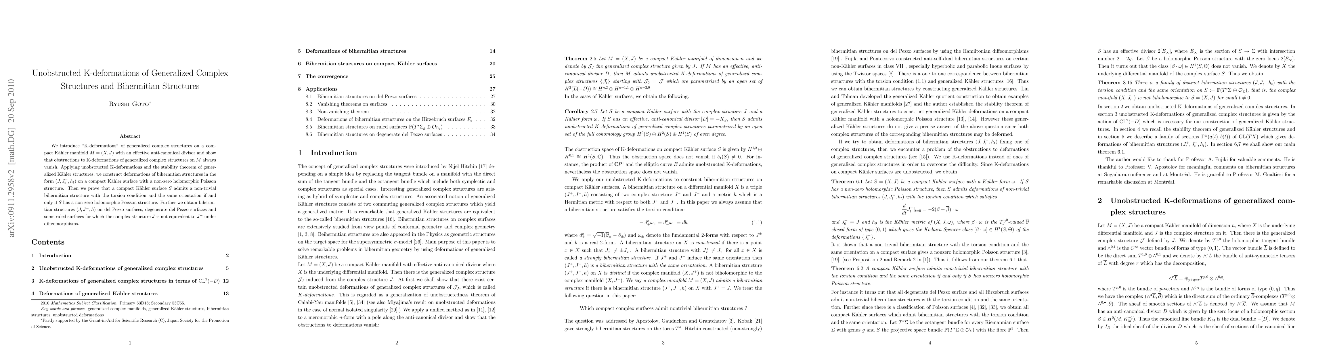 This paper demonstrates that K-deformations of generalized complex structures on a compact Kähler manifold always lack obstructions. It further constructs bihermitian structures using these deformations and proves that a compact Kähler surface supports a non-trivial bihermitian structure if and only if it possesses a non-zero holomorphic Poisson structure.