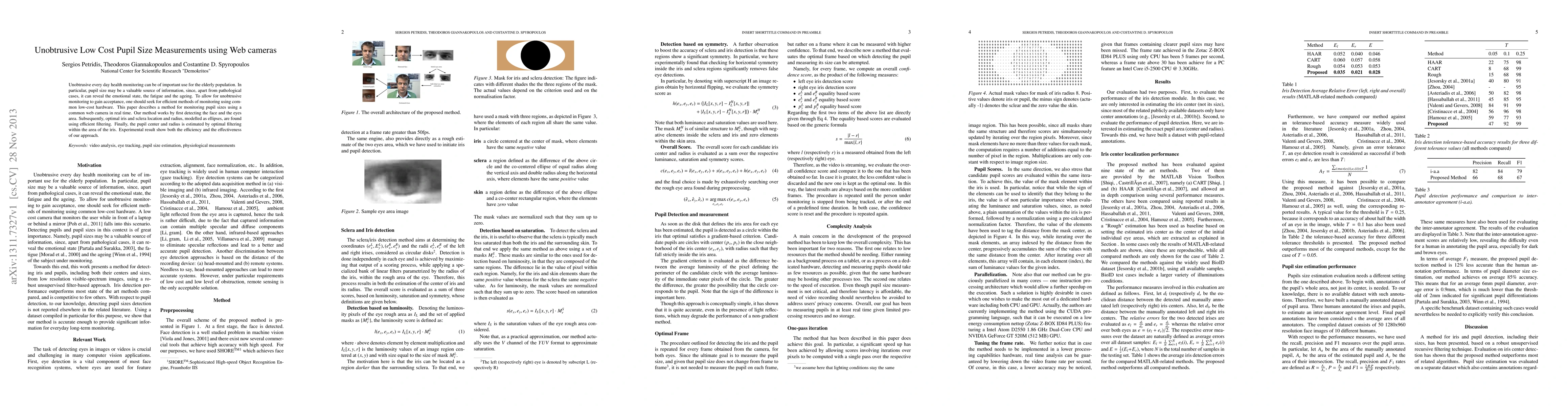 Unobtrusive every day health monitoring can be of important use for the elderly population. In particular, pupil size may be a valuable source of information, since, apart from pathological cases, it can reveal the emotional state, the fatigue and the ageing. To allow for unobtrusive monitoring to gain acceptance, one should seek for efficient methods of monitoring using com- mon low-cost hardware. This paper describes a method for monitoring pupil sizes using a common web camera in real time. Our method works by first detecting the face and the eyes area. Subsequently, optimal iris and sclera location and radius, modelled as ellipses, are found using efficient filtering. Finally, the pupil center and radius is estimated by optimal filtering within the area of the iris. Experimental result show both the efficiency and the effectiveness of our approach.