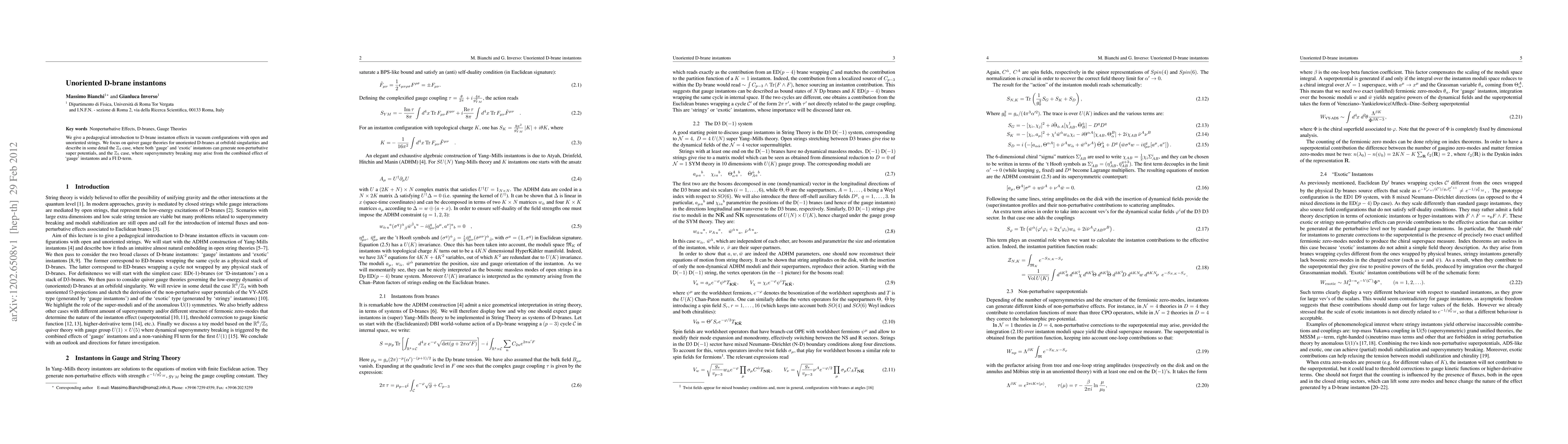 This paper provides an accessible introduction to D-brane instantons in vacuum configurations with open and unoriented strings, particularly focusing on quiver gauge theories for unoriented D-branes at orbifold singularities, with detailed discussions on Z_3 and Z_5 cases generating non-perturbative super potentials and potential supersymmetry breaking.