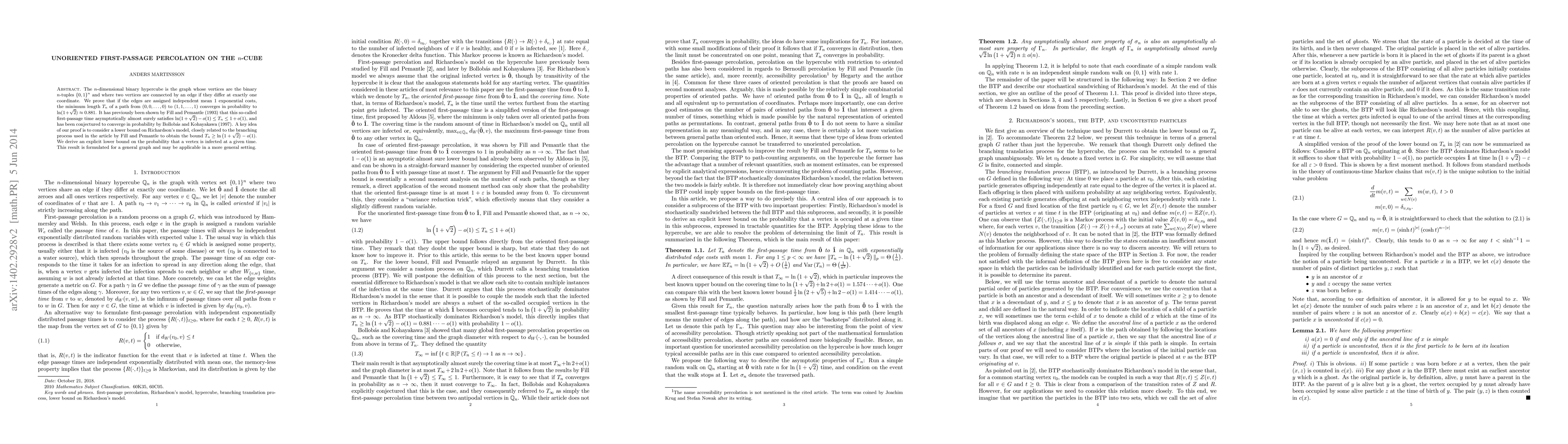 The $n$-dimensional binary hypercube is the graph whose vertices are the binary $n$-tuples $\{0, 1\}^n$ and where two vertices are connected by an edge if they differ at exactly one coordinate. We prove that if the edges are assigned independent mean 1 exponential costs, the minimum length $T_n$ of a path from $(0, 0, \dots, 0)$ to $(1, 1, \dots, 1)$ converges in probability to $\ln(1+\sqrt{2}) \approx 0.881$. It has previously been shown by Fill and Pemantle (1993) that this so-called first-passage time asymptotically almost surely satisfies $\ln(1+\sqrt{2}) - o(1) \leq T_n \leq 1+o(1)$, and has been conjectured to converge in probability by Bollob\'as and Kohayakawa (1997). A key idea of our proof is to consider a lower bound on Richardson's model, closely related to the branching process used in the article by Fill and Pemantle to obtain the bound $T_n \geq \ln\left(1+\sqrt{2}\right)-o(1)$. We derive an explicit lower bound on the probability that a vertex is infected at a given time. This result is formulated for a general graph and may be applicable in a more general setting.