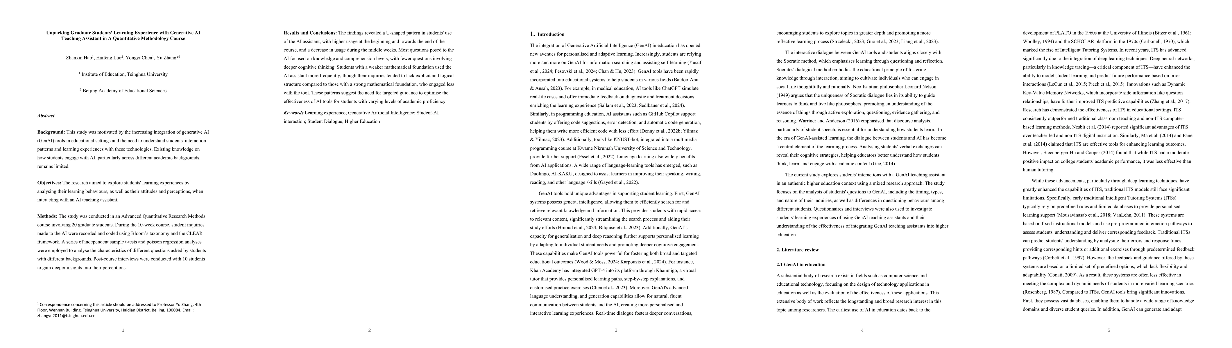 A study of 20 graduate students using AI in a quantitative course found that AI usage followed a U-shaped pattern, with higher use at the beginning and end of the course. The findings suggest the need for targeted guidance to optimize AI effectiveness for students with varying academic proficiency.