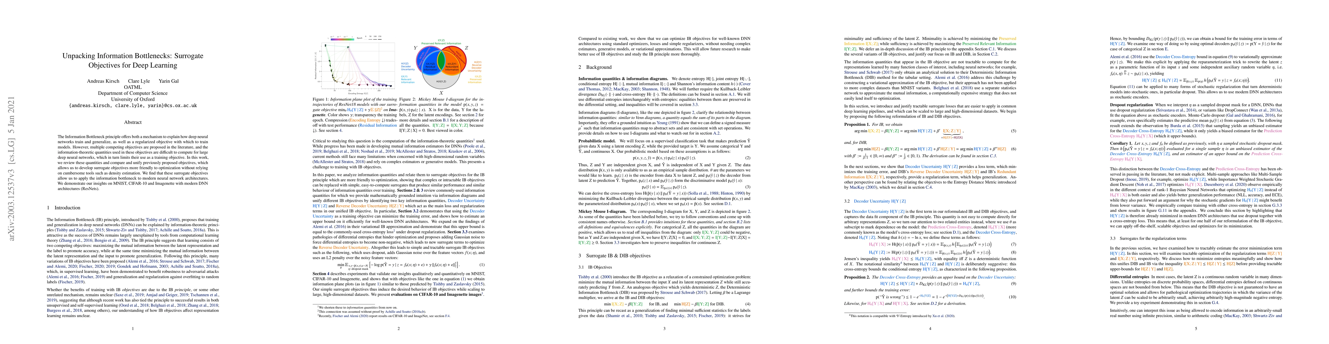 The Information Bottleneck principle offers both a mechanism to explain how deep neural networks train and generalize, as well as a regularized objective with which to train models. However, multiple competing objectives are proposed in the literature, and the information-theoretic quantities used in these objectives are difficult to compute for large deep neural networks, which in turn limits their use as a training objective. In this work, we review these quantities and compare and unify previously proposed objectives, which allows us to develop surrogate objectives more friendly to optimization without relying on cumbersome tools such as density estimation. We find that these surrogate objectives allow us to apply the information bottleneck to modern neural network architectures. We demonstrate our insights on MNIST, CIFAR-10 and Imagenette with modern DNN architectures (ResNets).