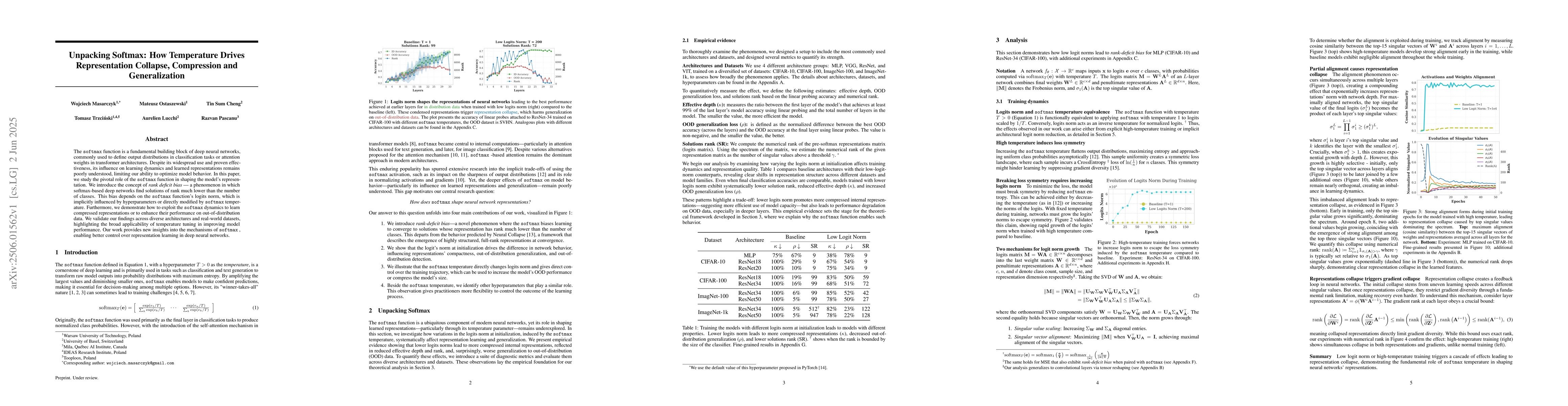 The paper explores how the softmax function influences learning dynamics and representation in deep neural networks, introducing a concept called rank deficit bias that can be controlled through temperature tuning. It highlights the potential to learn compressed representations and improve model performance on out-of-distribution data with temperature adjustments.