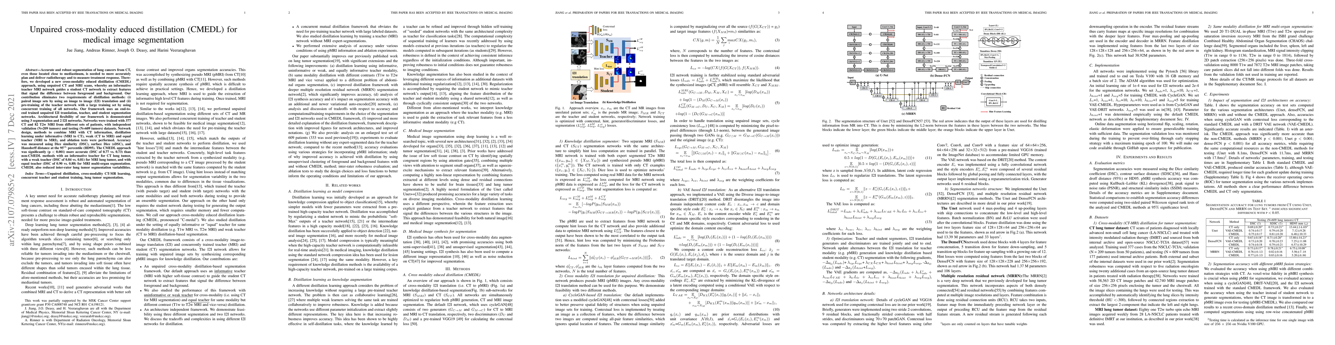 The paper introduces an unpaired cross-modality educed distillation (CMEDL) approach for segmenting lung cancers in CT scans using unpaired CT and MRI data. The proposed method significantly improves segmentation accuracy compared to non-CMEDL methods, demonstrating higher Dice similarity coefficients across various tumor segmentations.