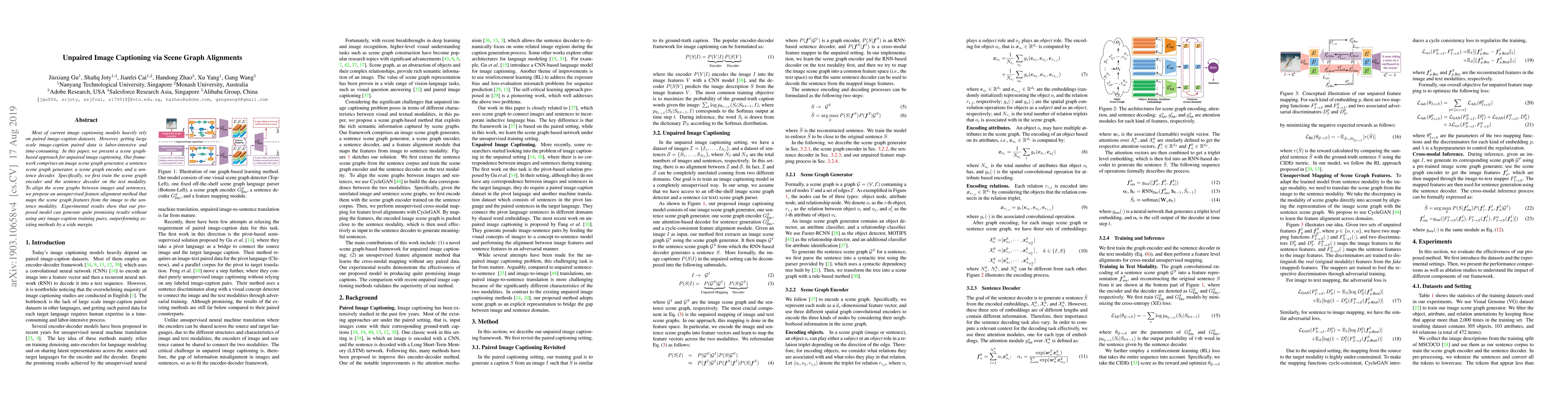 This paper introduces an unpaired image captioning method using scene graph alignments, comprising an image scene graph generator, a sentence scene graph generator, and an unsupervised feature alignment technique. The model achieves promising results without paired image-caption data, outperforming existing methods.