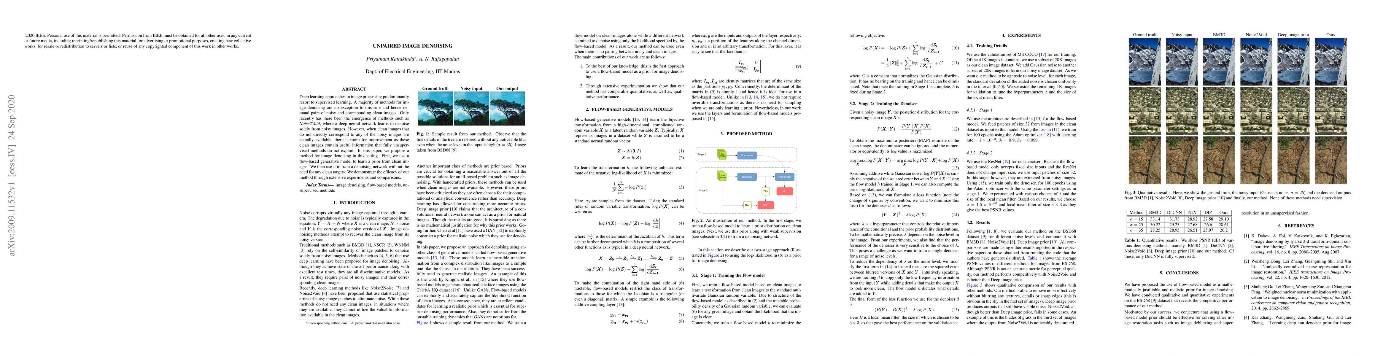 This paper proposes a method for unpaired image denoising that leverages a flow-based generative model trained on clean images to guide a denoising network, eliminating the need for paired noisy and clean image datasets. The method is shown to effectively utilize available clean images to improve denoising performance.