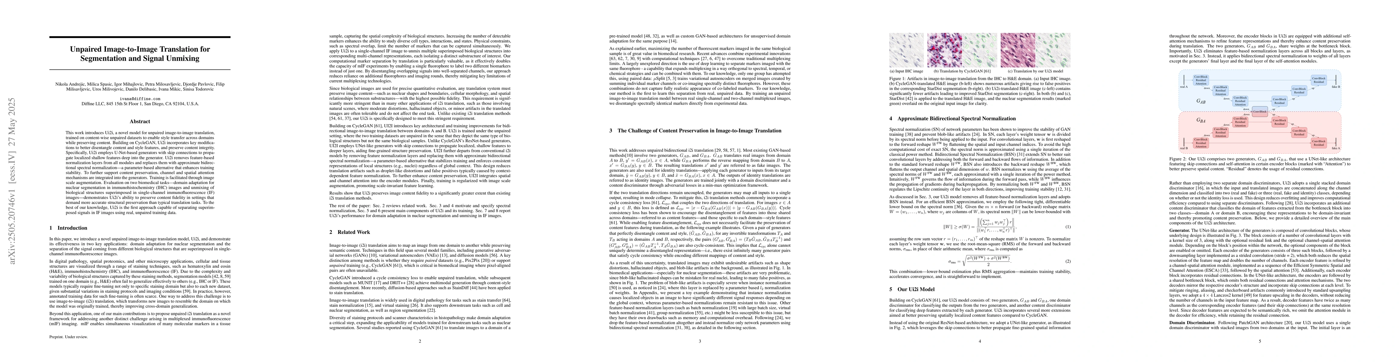 This work introduces Ui2i, a novel model for unpaired image-to-image translation, trained on content-wise unpaired datasets to enable style transfer across domains while preserving content. Building on CycleGAN, Ui2i incorporates key modifications to better disentangle content and style features, and preserve content integrity. Specifically, Ui2i employs U-Net-based generators with skip connections to propagate localized shallow features deep into the generator. Ui2i removes feature-based normalization layers from all modules and replaces them with approximate bidirectional spectral normalization -- a parameter-based alternative that enhances training stability. To further support content preservation, channel and spatial attention mechanisms are integrated into the generators. Training is facilitated through image scale augmentation. Evaluation on two biomedical tasks -- domain adaptation for nuclear segmentation in immunohistochemistry (IHC) images and unmixing of biological structures superimposed in single-channel immunofluorescence (IF) images -- demonstrates Ui2i's ability to preserve content fidelity in settings that demand more accurate structural preservation than typical translation tasks. To the best of our knowledge, Ui2i is the first approach capable of separating superimposed signals in IF images using real, unpaired training data.