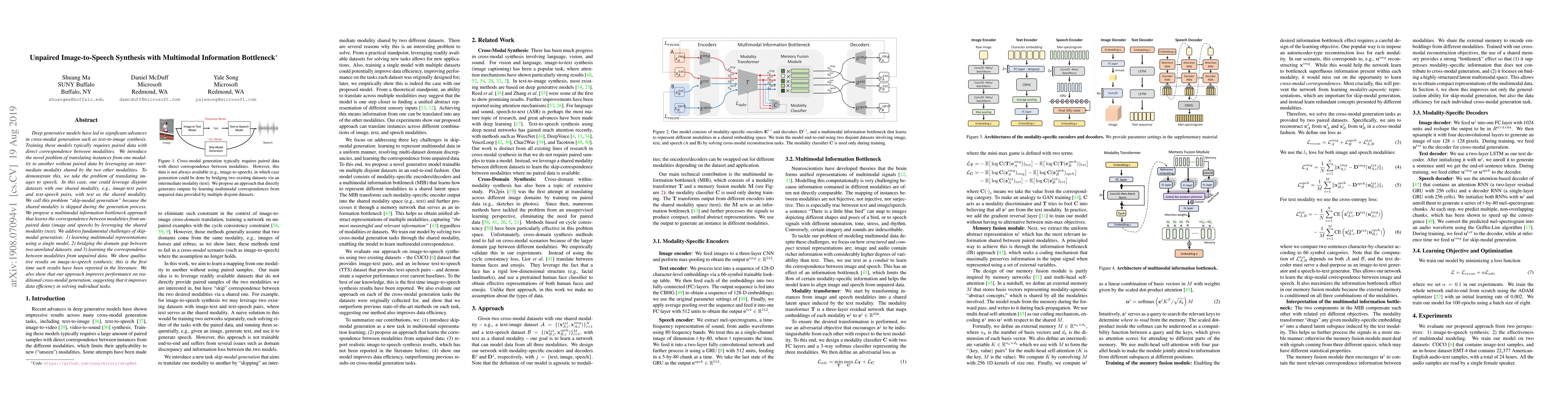 Deep generative models have led to significant advances in cross-modal generation such as text-to-image synthesis. Training these models typically requires paired data with direct correspondence between modalities. We introduce the novel problem of translating instances from one modality to another without paired data by leveraging an intermediate modality shared by the two other modalities. To demonstrate this, we take the problem of translating images to speech. In this case, one could leverage disjoint datasets with one shared modality, e.g., image-text pairs and text-speech pairs, with text as the shared modality. We call this problem "skip-modal generation" because the shared modality is skipped during the generation process. We propose a multimodal information bottleneck approach that learns the correspondence between modalities from unpaired data (image and speech) by leveraging the shared modality (text). We address fundamental challenges of skip-modal generation: 1) learning multimodal representations using a single model, 2) bridging the domain gap between two unrelated datasets, and 3) learning the correspondence between modalities from unpaired data. We show qualitative results on image-to-speech synthesis; this is the first time such results have been reported in the literature. We also show that our approach improves performance on traditional cross-modal generation, suggesting that it improves data efficiency in solving individual tasks.