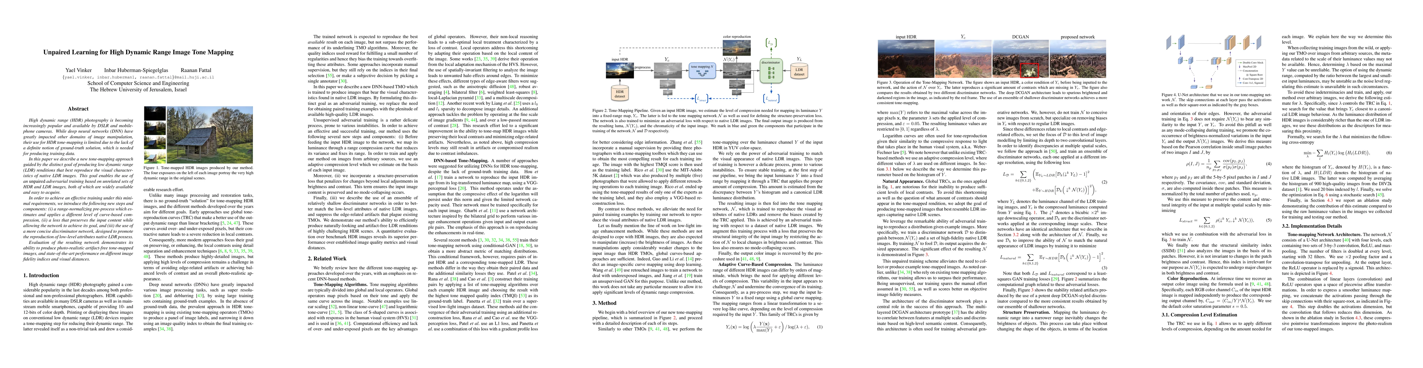 This paper proposes an unpaired learning method for HDR tone-mapping using adversarial training, achieving photo-realistic results by normalizing the input range and employing a specialized discriminator network to reproduce low-level attributes of native LDR images. The approach leverages widely available HDR and LDR images without requiring paired data.