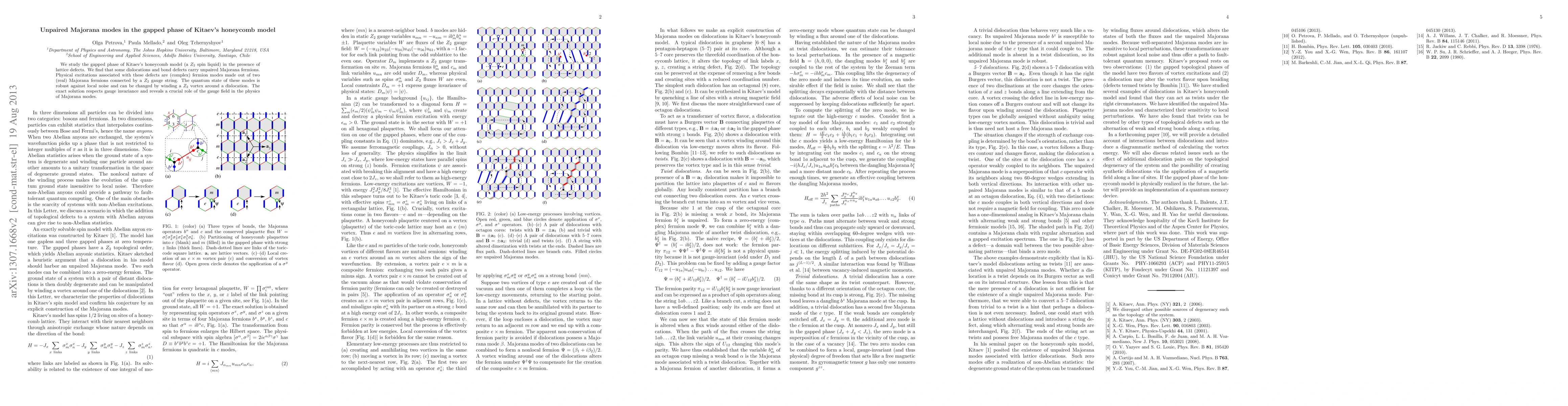 This paper explores the gapped phase of Kitaev's honeycomb model, revealing that lattice defects like dislocations and bond defects host unpaired Majorana fermions. These Majorana modes are robust against local noise and can be manipulated by winding Z_2 vortices, highlighting the gauge field's essential role in their physics.