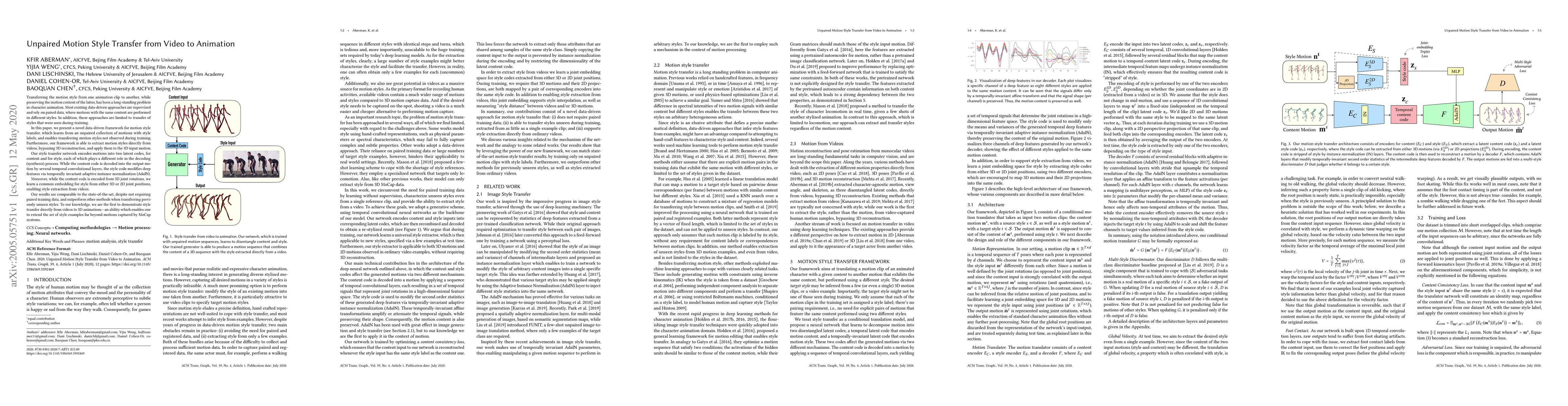 This paper introduces a novel unpaired data-driven framework for transferring motion styles from videos to 3D animations without requiring paired training data. It employs latent codes for content and style, enabling the transfer of previously unseen styles and bypassing 3D reconstruction.