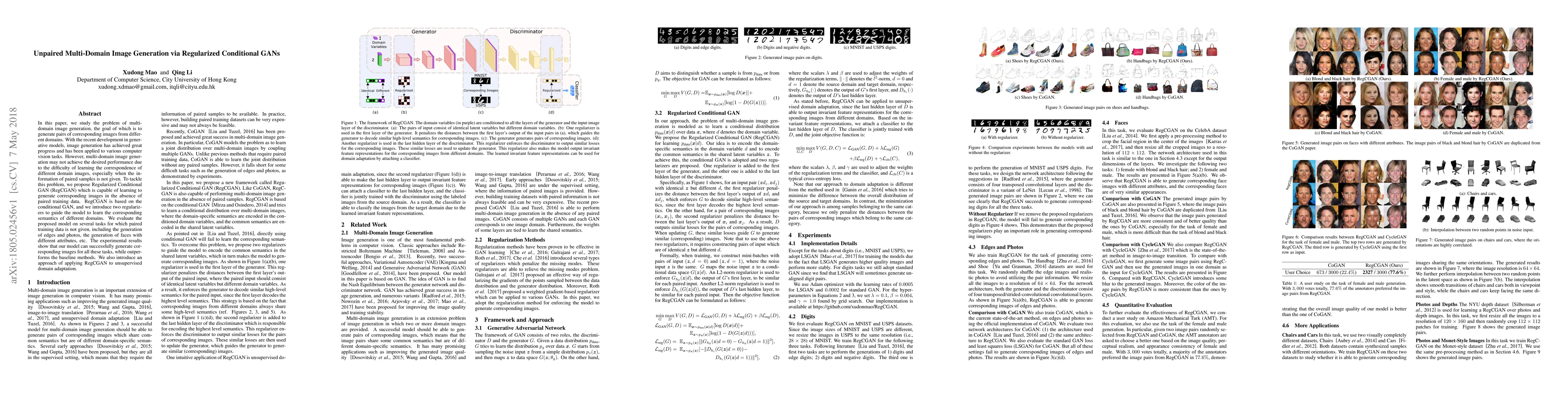 This paper proposes a Regularized Conditional GAN (RegCGAN) to generate corresponding images across different domains without paired training data, introducing two regularizers to learn domain-specific semantics. Experimental results show superior performance in tasks like edge-to-photo and attribute-based face generation compared to baseline methods.