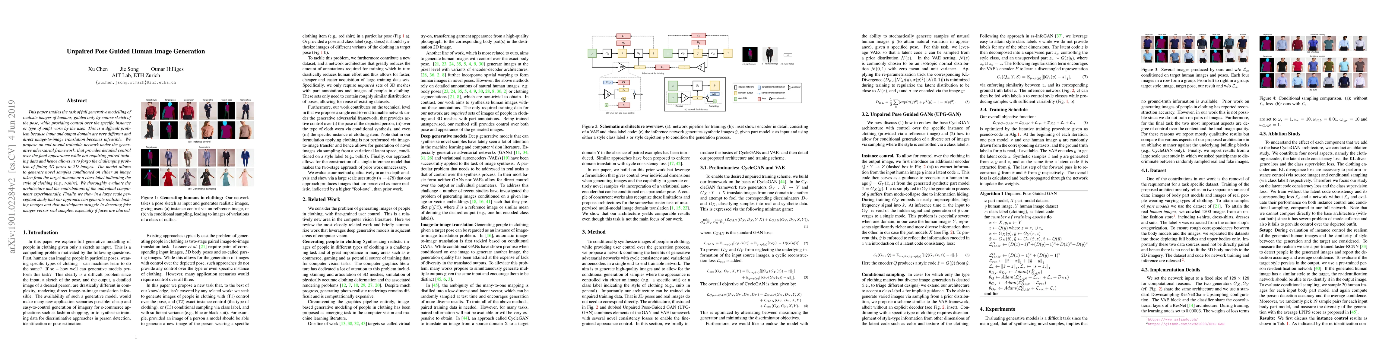 This paper studies the task of full generative modelling of realistic images of humans, guided only by coarse sketch of the pose, while providing control over the specific instance or type of outfit worn by the user. This is a difficult problem because input and output domain are very different and direct image-to-image translation becomes infeasible. We propose an end-to-end trainable network under the generative adversarial framework, that provides detailed control over the final appearance while not requiring paired training data and hence allows us to forgo the challenging problem of fitting 3D poses to 2D images. The model allows to generate novel samples conditioned on either an image taken from the target domain or a class label indicating the style of clothing (e.g., t-shirt). We thoroughly evaluate the architecture and the contributions of the individual components experimentally. Finally, we show in a large scale perceptual study that our approach can generate realistic looking images and that participants struggle in detecting fake images versus real samples, especially if faces are blurred.